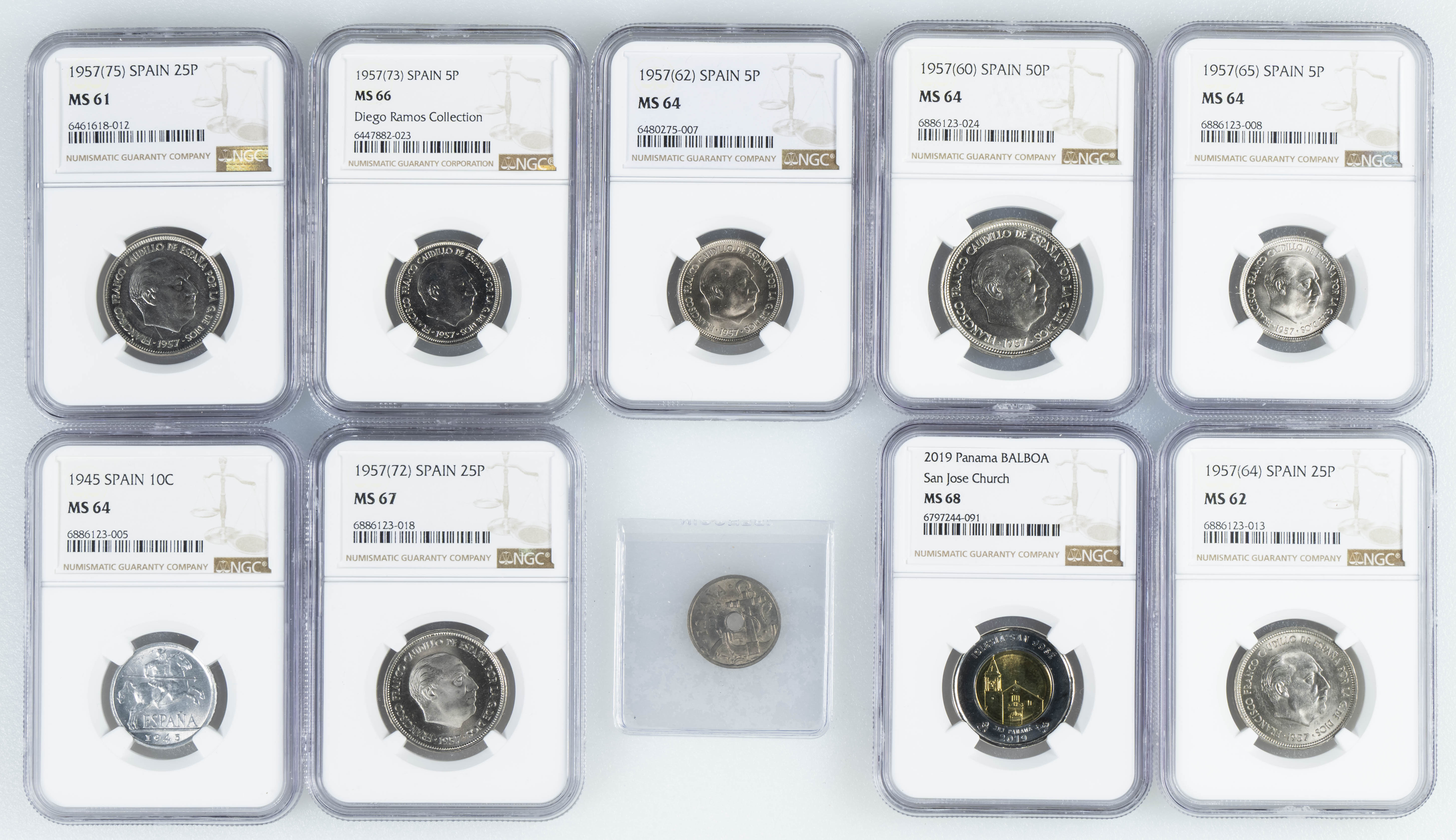 ESTADO ESPAÑOL (1936-1975). Conjunto de 10 monedas de las cuales 8 son piezas con módulos de 5, 25 y 50 Pesetas de 1957. Todas éstas encapsuladas por NGC y en calidad MS (61-67). El conjunto incluye además 50 Céntimos de 1949 con estrellas invertidas en excelente calidad y 1 Balboa de 2019 también encapsulado. A EXAMINAR