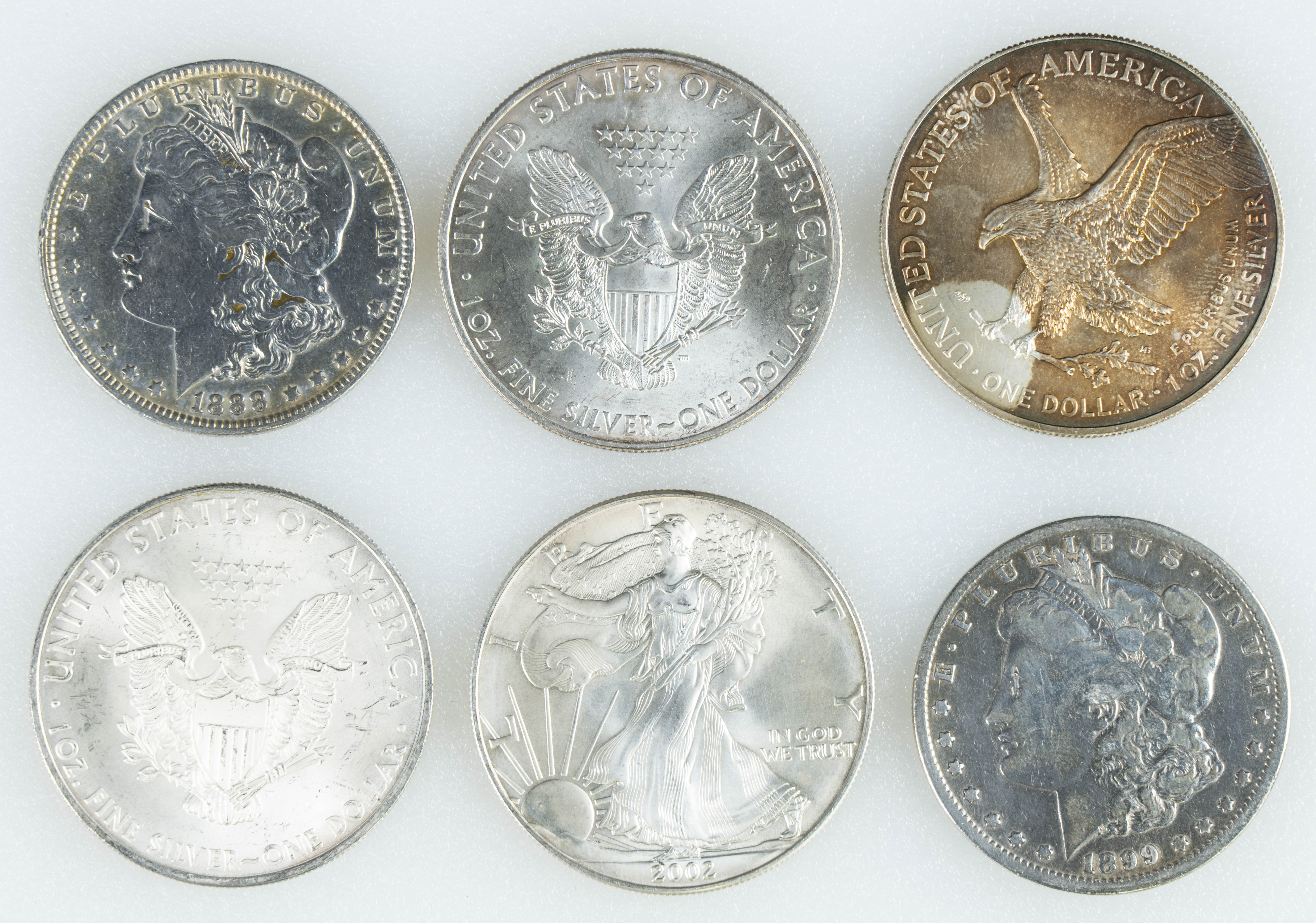 ESTADOS UNIDOS. Conjunto de 6 piezas en plata de 1 Dollar de diferentes épocas (tipo Morgan y Silver Eagle). Sin piezas repetidas. Diferentes estados de conservación. A EXAMINAR.