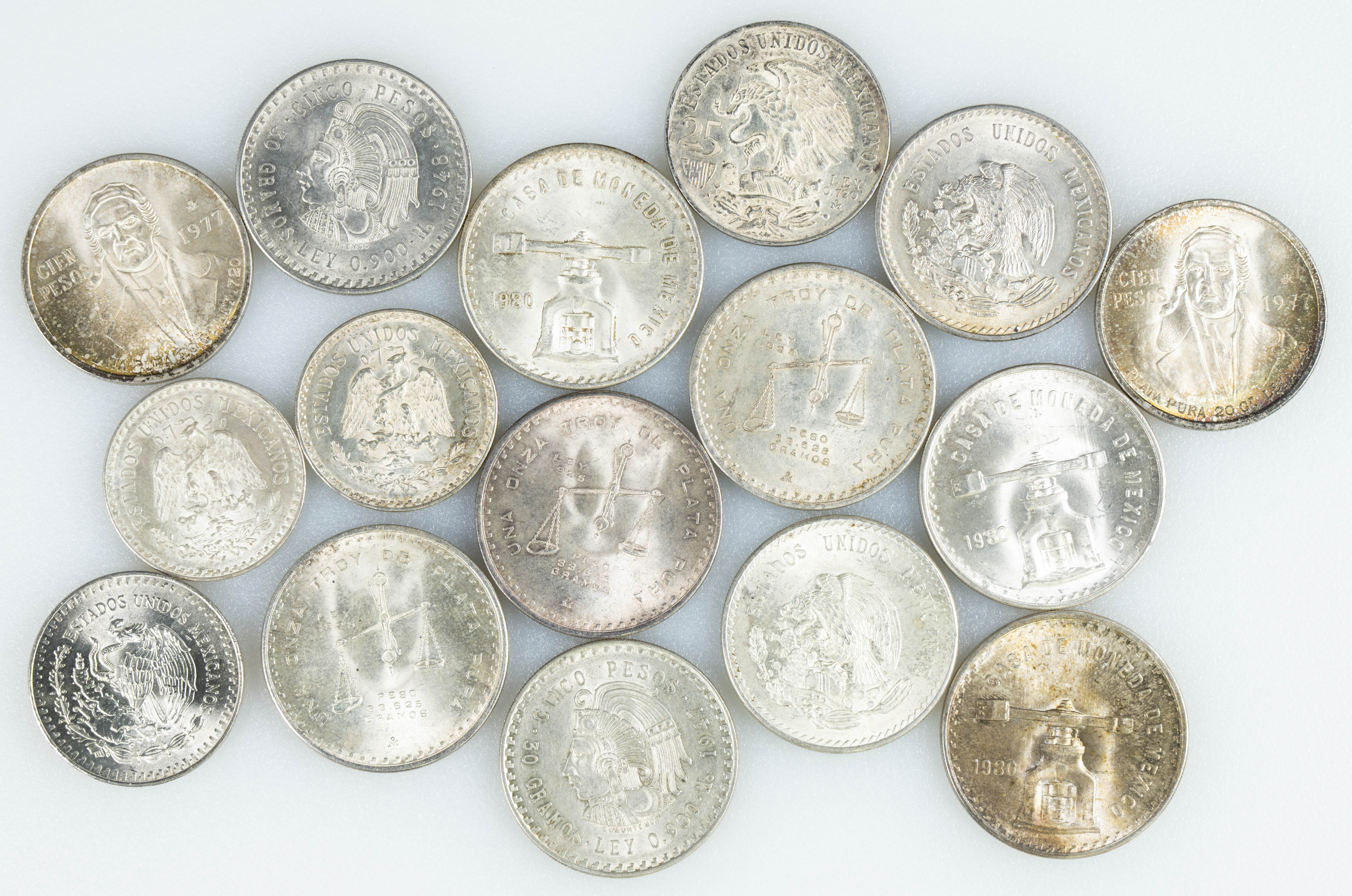 MÉXICO. Extraordinario conjunto de 16 piezas en plata que incluye onzas tipo troy y módulos diversos de pesos. Acuñaciones comprendidas entre 1938 y 1985. Peso total del conjunto aproximado: 460g. Alto nivel de conservación. A EXAMINAR.