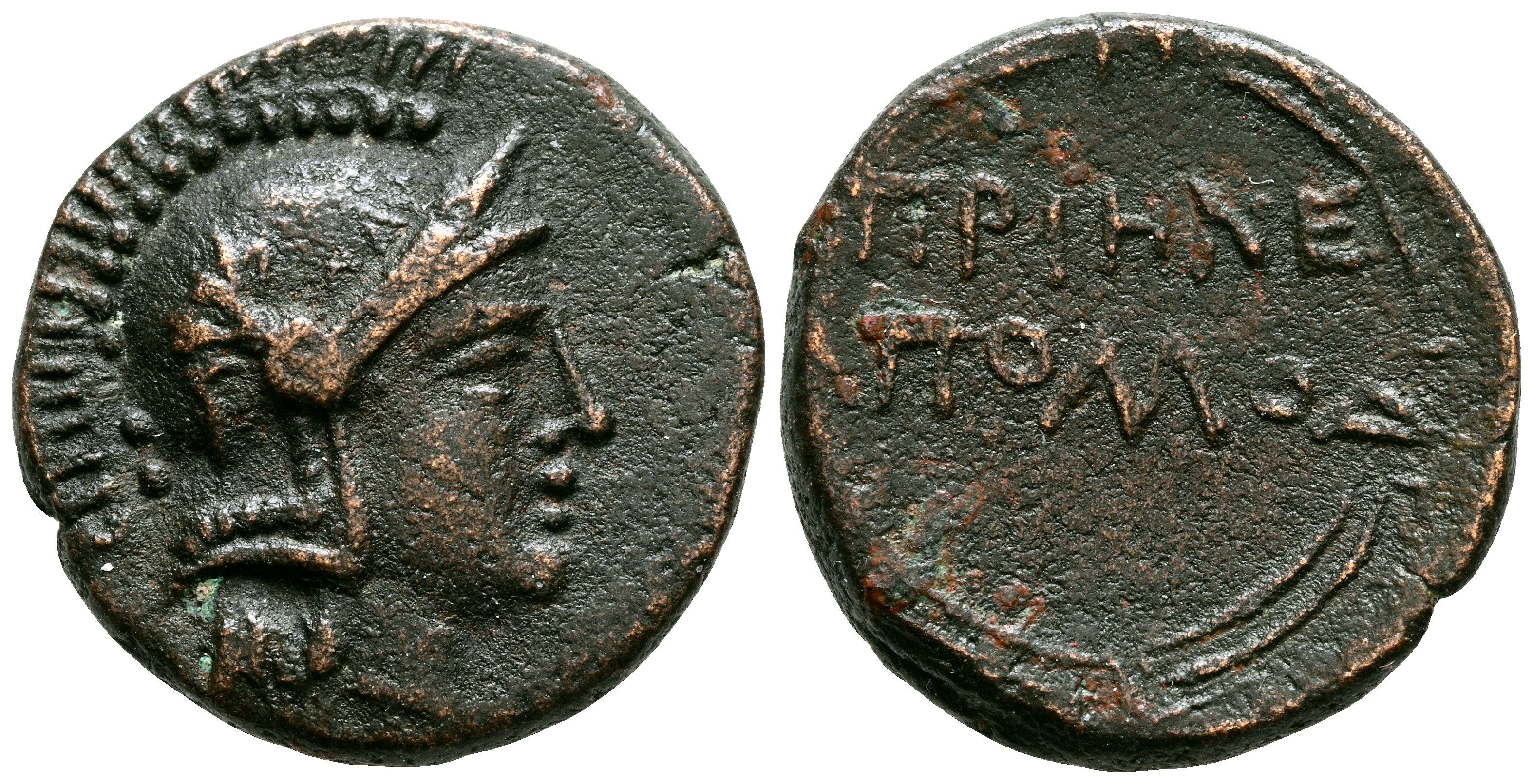 IONIA, Priene. Ae16. (Ae. 3,46g/16mm). 240-170 a.C. (SNG Copenhagen 1093). Anv: Cabeza de Atenea con casco derecha. Rev: ΠΡΙΗN AΠOΛΛOΔ, dentro de un patrón circular de meandro. MBC+.