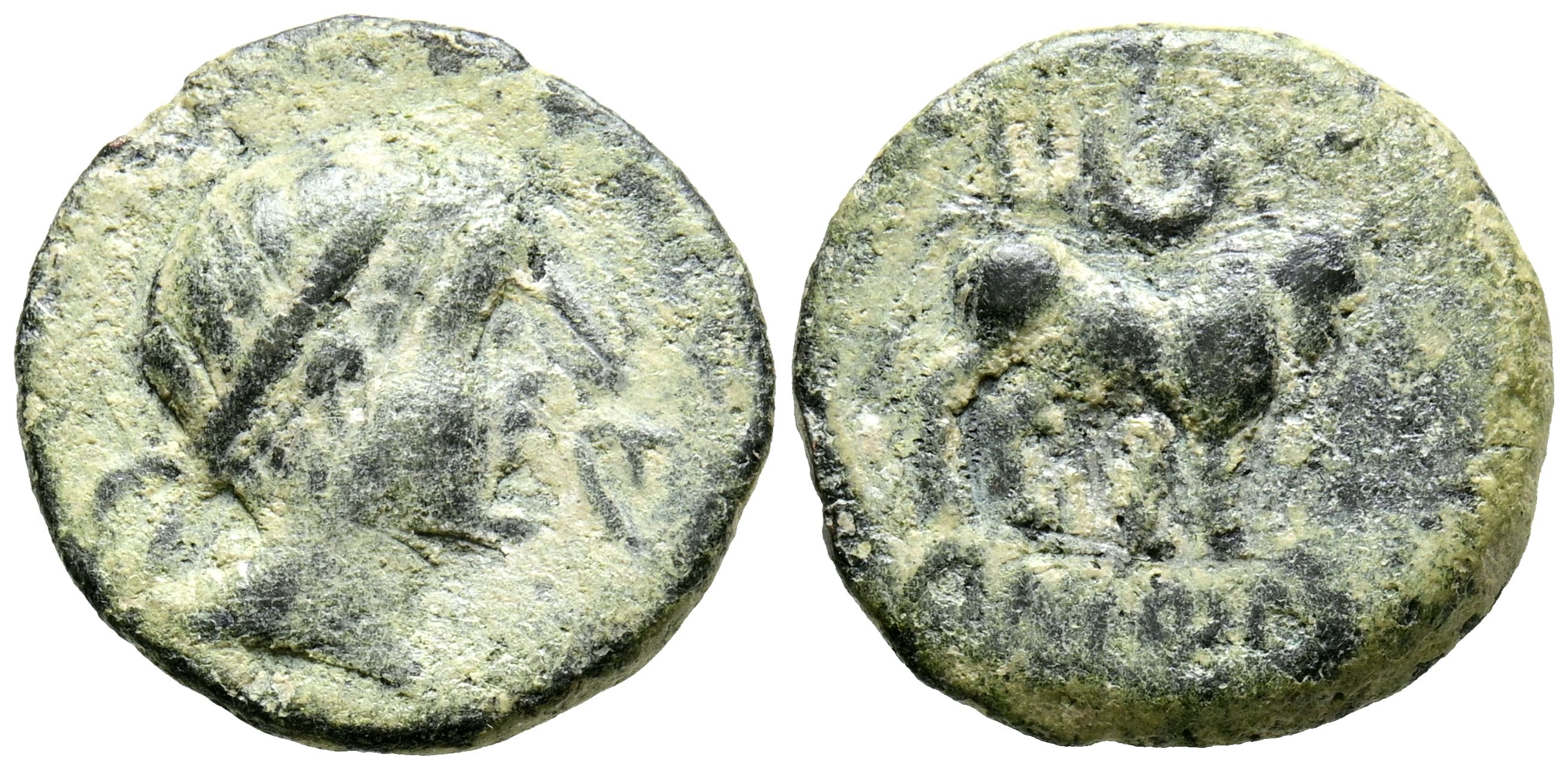 CASTULO (Cazlona, Jaén). Semis. (Ae. 3,50g/18mm). 180 a.C. (FAB-722). Anv: Cabeza masculina diademada a derecha, delante letra ibérica: Ca. Rev: Toro a derecha, encima letra L y creciente, en exergo leyenda ibérica: CaSTeLe. MBC.
