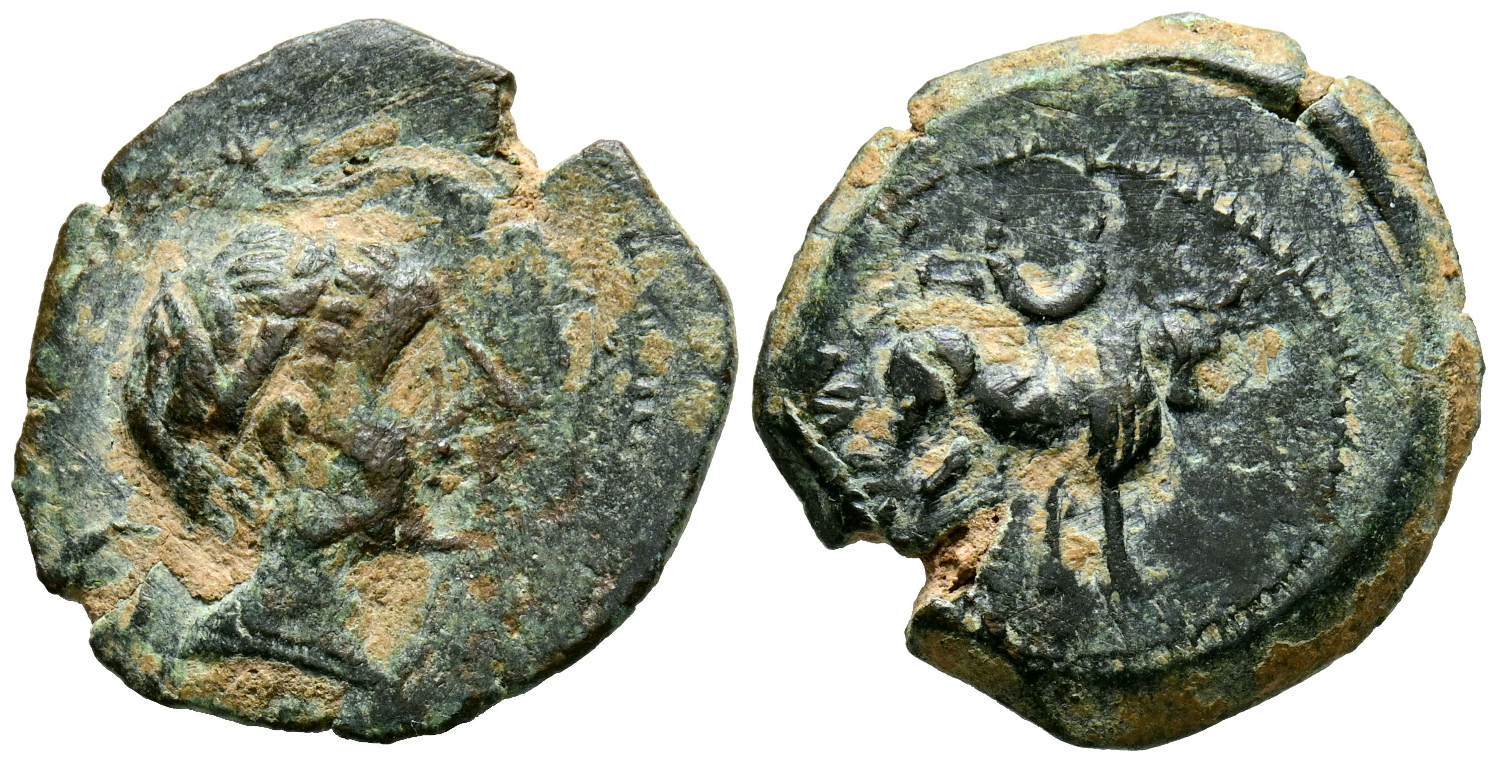 CASTULO (Cazorla, Jaén). Semis. (Ae. 4,62g/20mm). 180 a.C. (FAB-722). Anv: Cabeza masculina diademada a derecha, delante letra ibérica: Ca. Rev: Toro a derecha, encima letra L y creciente, en exergo leyenda ibérica: CaSTeLe. MBC-.