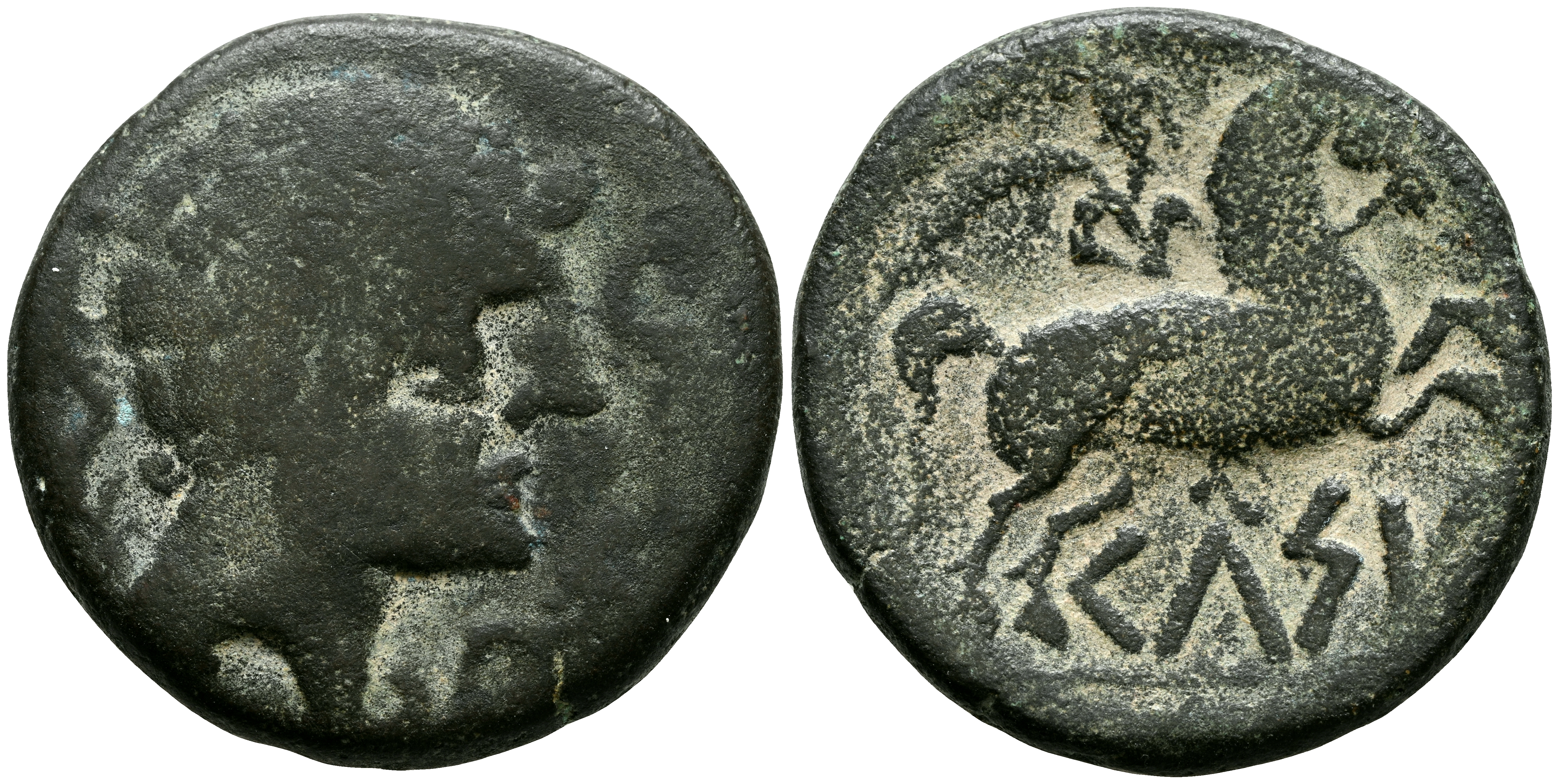 CELSE (Velilla de Ebro, Zaragoza). As. (Ae. 14,94g/28mm). 120-50 a.C. (FAB-771). Anv: Cabeza masculina a derecha con manto y fíbula, alrededor de tres delfines. Rev: Jinete con palma a derecha, debajo leyenda ibérica sobre línea: CeLSE. MBC-.