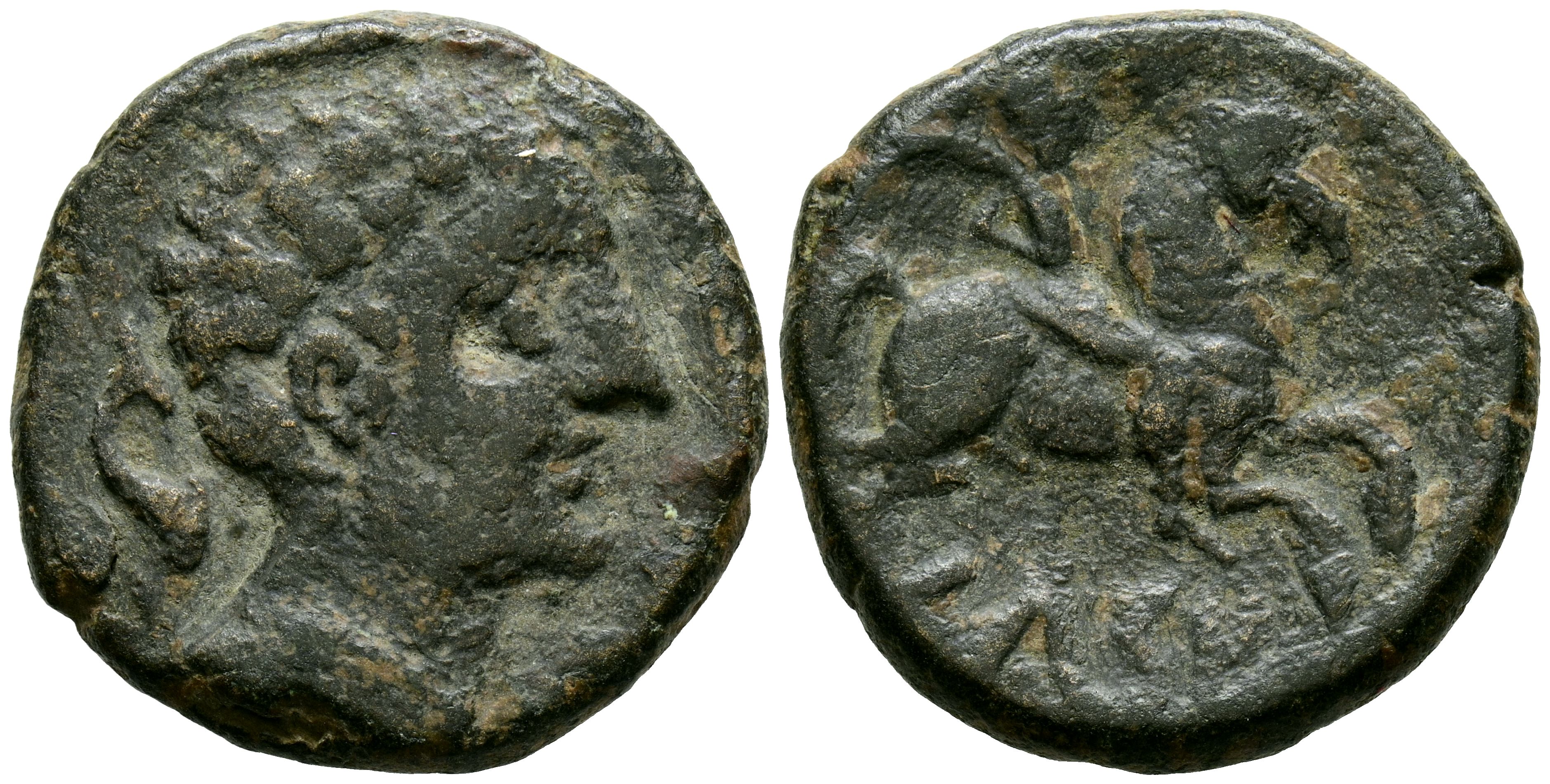 CELSE (Velilla del Ebro, Zaragoza). As. (Ae. 13,60g/27mm). 120-50 a.C. (FAB-771). Anv: Cabeza a derecha con manto y fíbula a derecha, alrededor tres delfines. Rev: Jinete con palma a derecha, debajo leyenda ibérica sobre línea: CeLSE. MBC-. Limpiada.