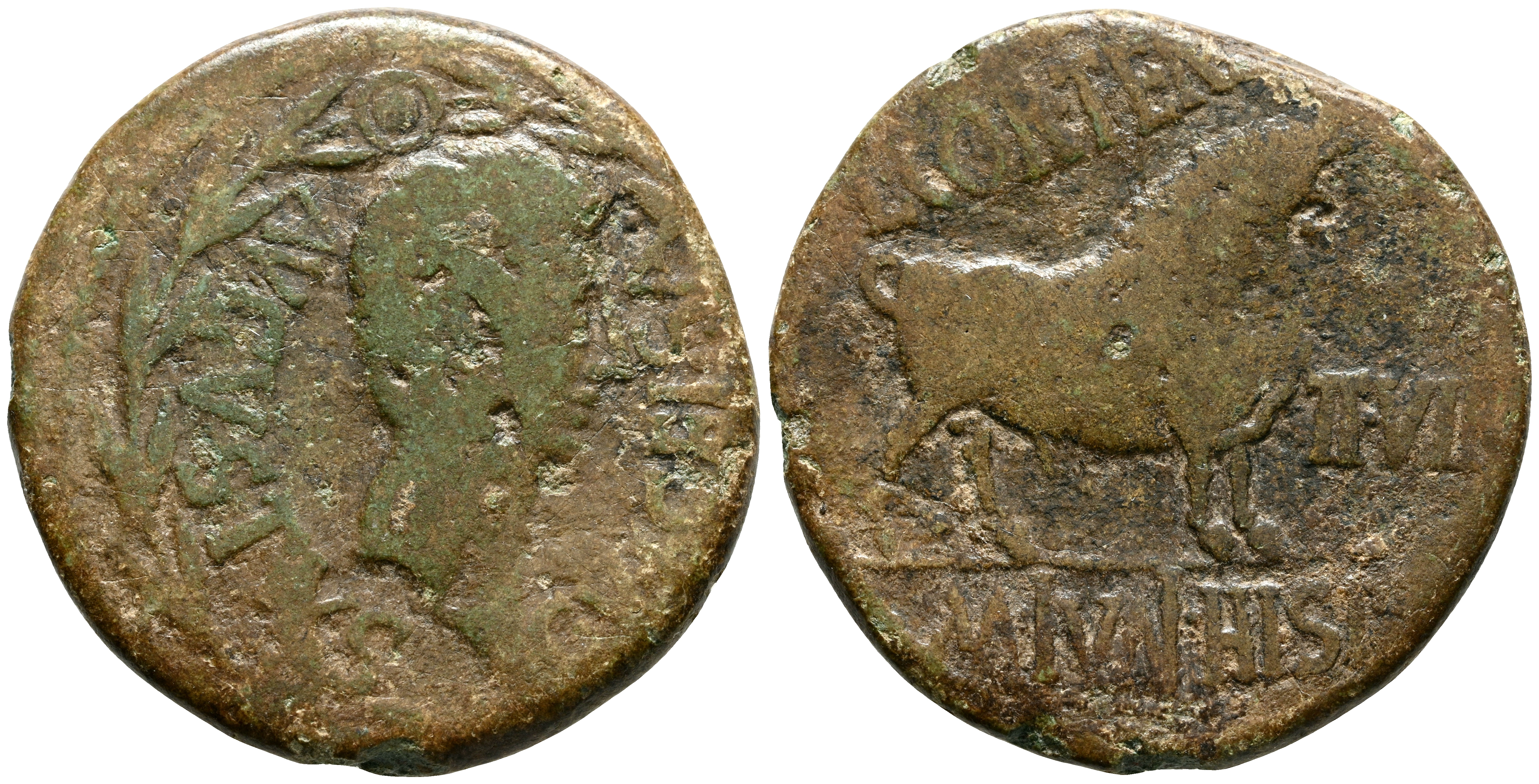 CELSE (Velilla del Ebro, Zaragoza). As. (Ae. 8,94g/27mm). 27 a.C-14 d.C. (FAB-806). Anv: Cabeza de Augusto a derecha, alrededor leyenda: AVGVST C VI CELSA, todo dentro de corona de laurel. Rev: Toro estante a derecha, alredeor leyenda: L COR TERR M IVN HISP II VIR. MBC-.