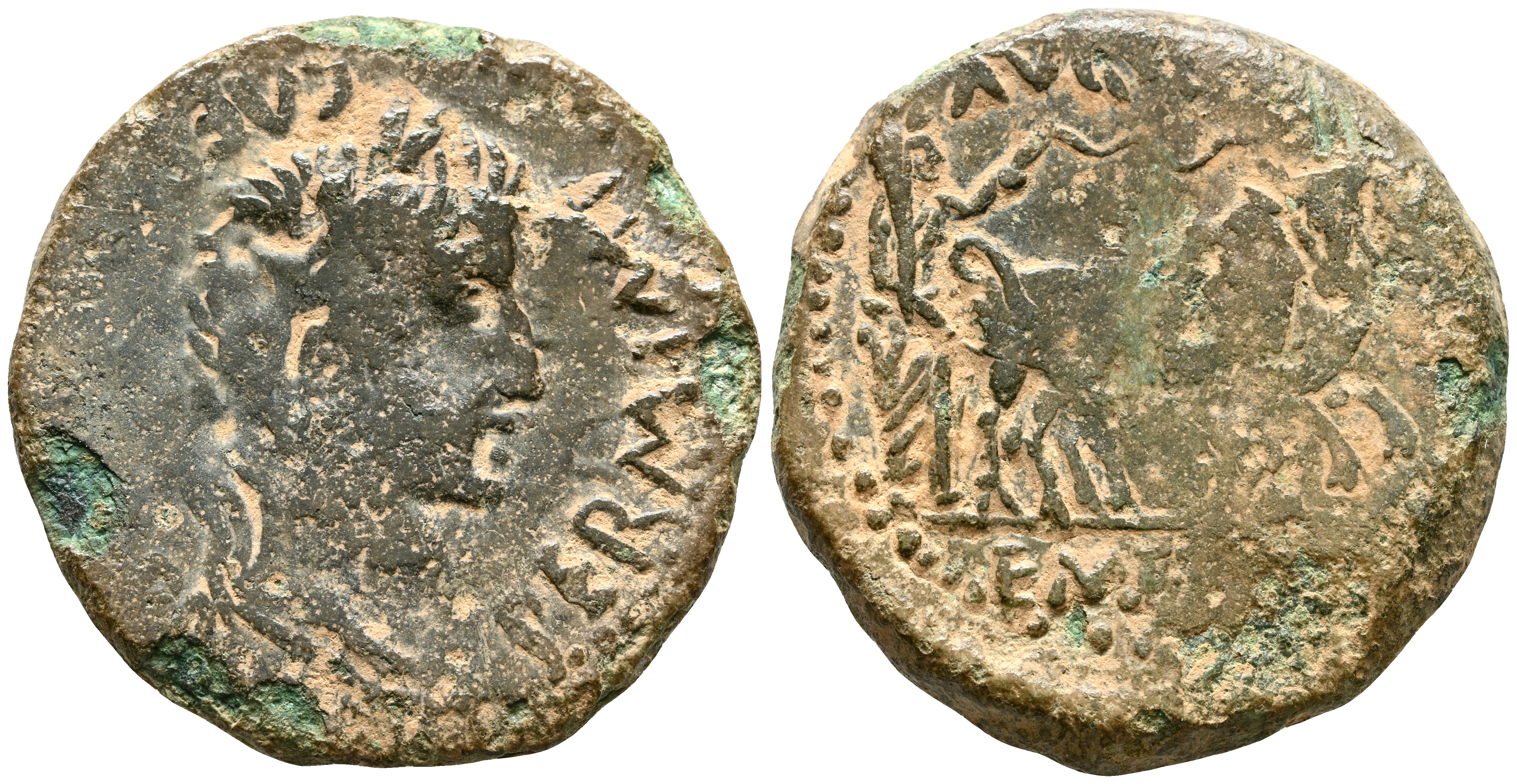EMERITA AUGUSTA (Mérida, Badajoz). As. (Ae. 8,21g/25mm). 22 a.C.-14 d.C. (FAB-1012). Anv: Cabeza laureada de Augusto a derecha, alrededor leyenda: PERM IMP CAESARIS AVG P P. Rev: Yunta a derecha, alrededor leyenda: AVGVSTA EMERITA. MBC-. Oxidaciones.