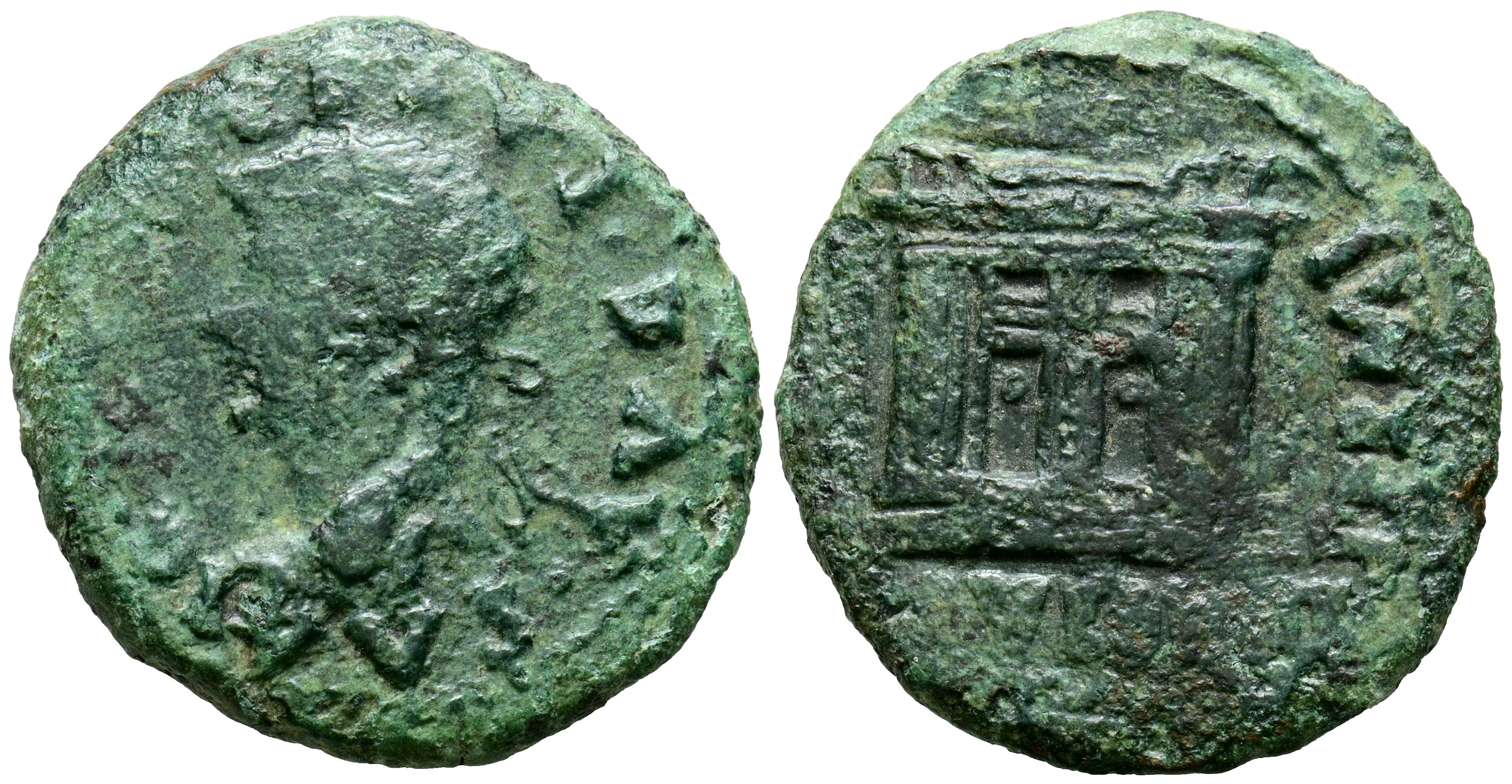 EMERITA AUGUSTA (Mérida, Badajoz). As. (Ae. 10,93g/27mm). 14-36 d.C. (FAB-1051). Anv: Cabeza de Augusto radiado a izquierda, alrededor leyenda: DIVVS AVG PATER CAE. Rev: Ara, alrededor leyenda: PERMI AVG PROVIDENT. MBC-.