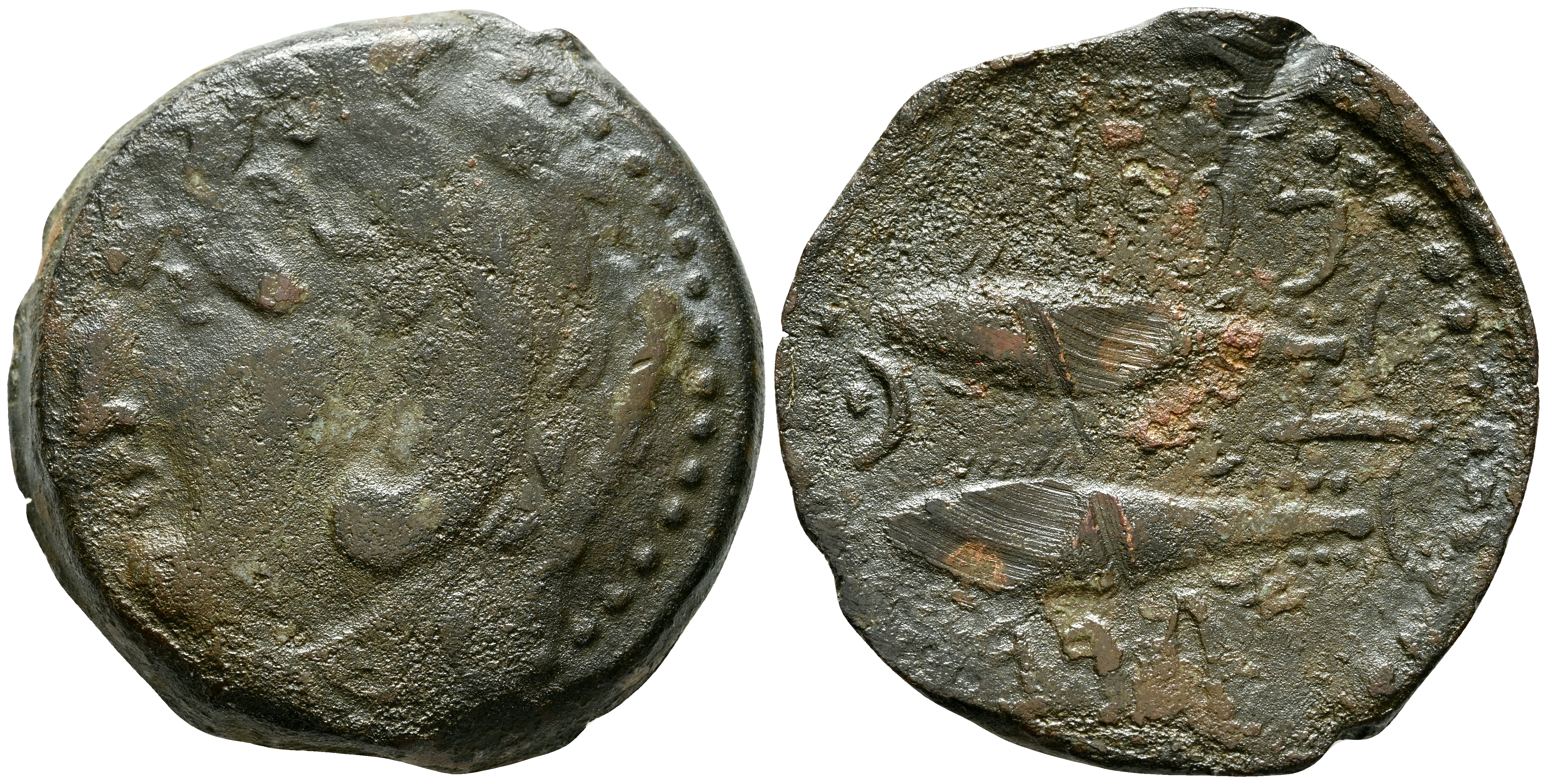 GADES (Cádiz). As. (Ae. 15,45g/26mm). 100-20 a.C. (FAB-1343). Anv: Cabeza de Hércules con piel de león a izquierda portando mazo. Rev: Dos atunes a izquierda, entre ellos creciente con punto y caduceo, alrededor leyenda púnica. MBC-.