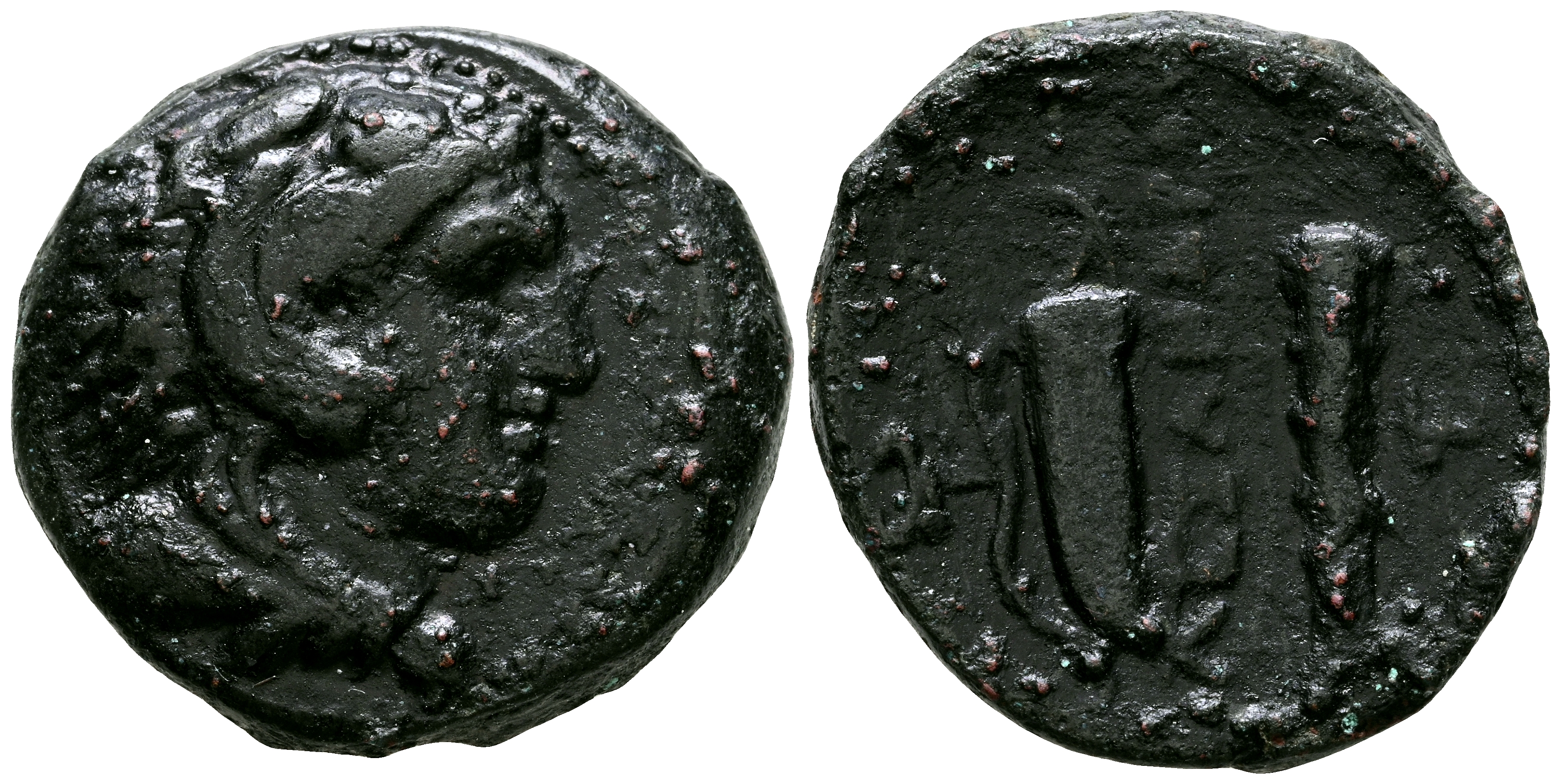 REYES DE MACEDONIA, Alejandro III el Grande. Ae19. (Ae. 5,59g/19mm). 336-323 d.C. Ceca incierta. (Price 266; HGC 3.1, 925a). Anv: Cabeza de Hércules con piel de león a derecha. Rev: Leyenda griega: AΛΕΞΑΝΔΡOY, entre arco con carcaj y mazo. MBC.