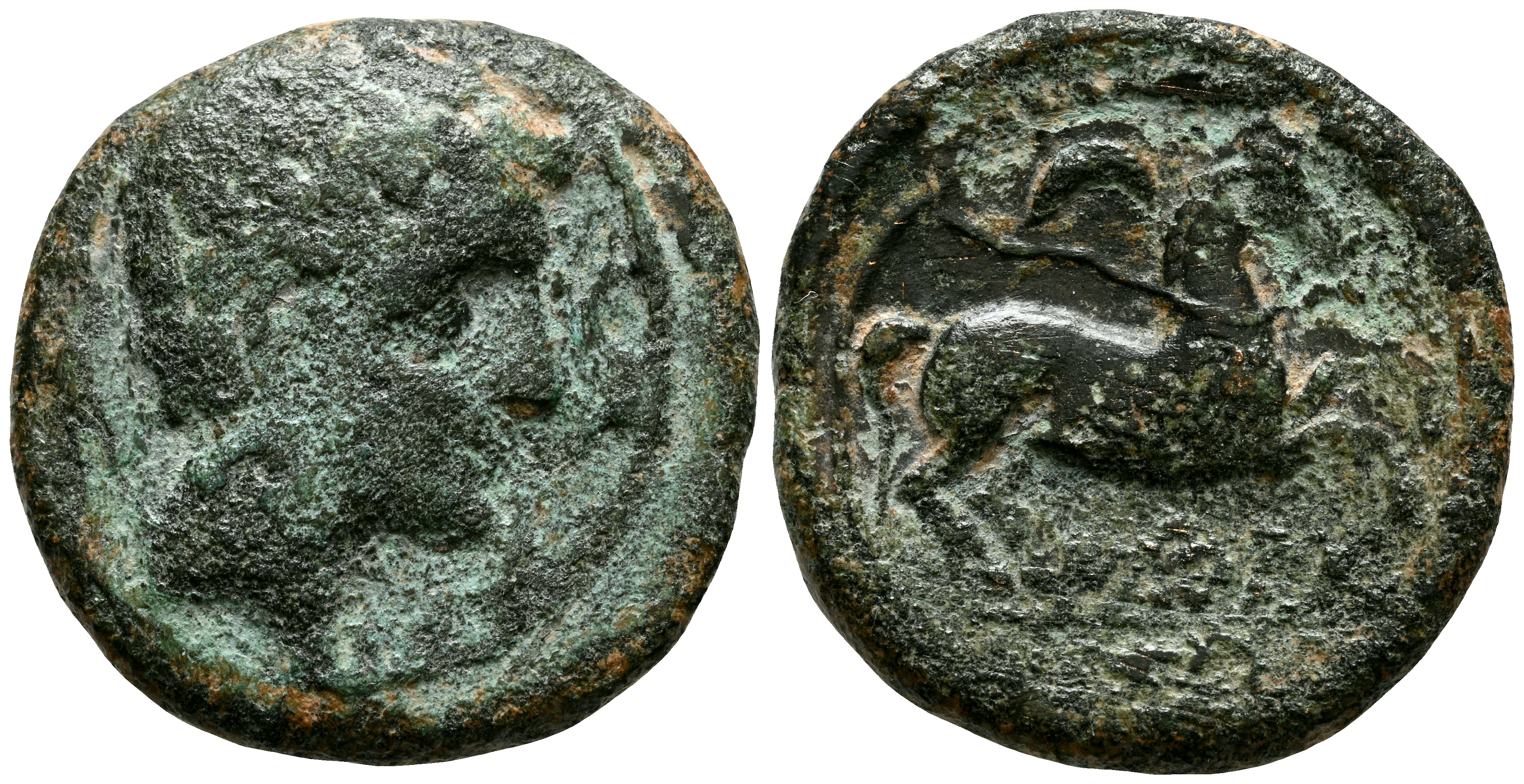 ILTIRTA (Lérida). Semis. (Ae. 5,48g/21mm). 220-200 a.C. (FAB-1472). Anv: Cabeza masculina con collar y manto a derecha, alrededor tres delfines. Rev: Caballo con rienda suelta galopando a derecha, encima creciente, debajo leyenda ibérica sobre línea: ILTiRT. MBC-.