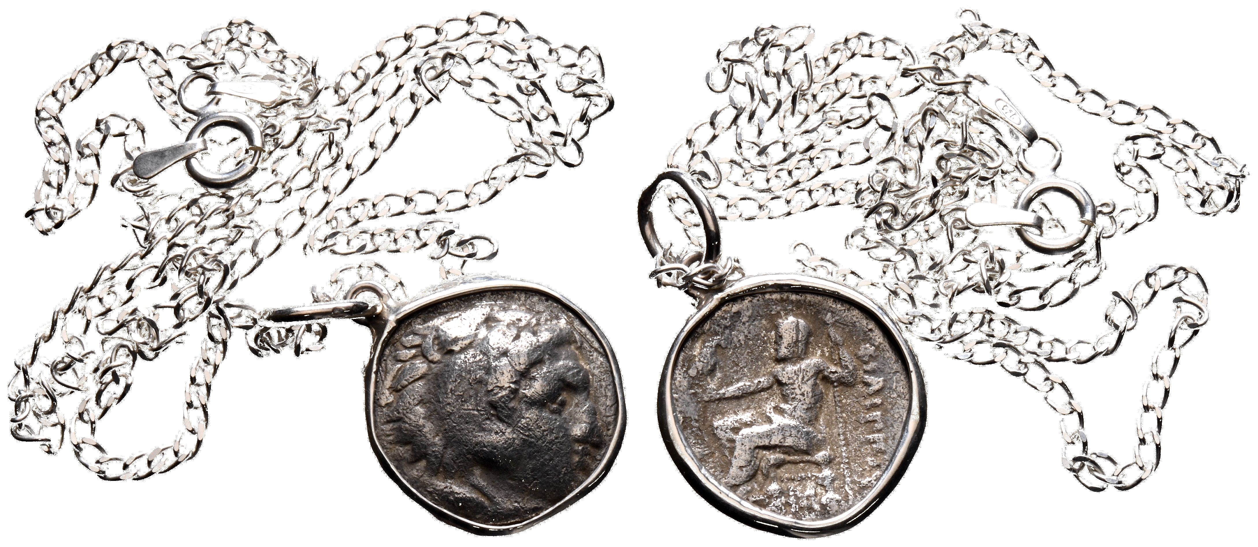 REYES DE MACEDONIA, Alejandro III el Grande. Dracma. (Ar. 8,27g/21mm). 336-323 a.C. Lampsakos. (Price 1398). Anv: Cabeza de Heracles con piel de león a derecha. Rev: Zeus sentado a izquierda portando cetro y águila, delante parte delantera monograma: KI, debajo del trono monograma: NO, detrás leyenda griega: AΛEΞANΔPOY. MBC. La pieza se encuentra engarzada a modo de colgante e inlcuye cadena.