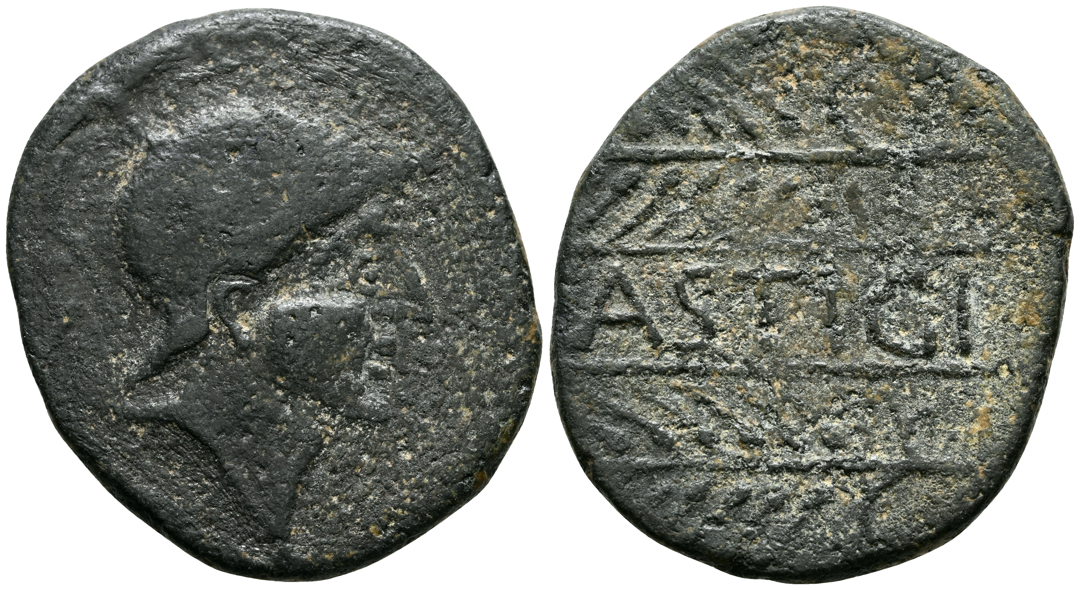 LASTIGI (cerca de Aznalcóllar, Sevilla). As. (Ae. 6,10g/24mm). 150-50 d.C. (FAB-1675). Anv: Cabeza masculina con casco a derecha, dentro de láurea. Rev: Leyenda: LASTIGI, entre dos espigas a izquierda. MBC-.
