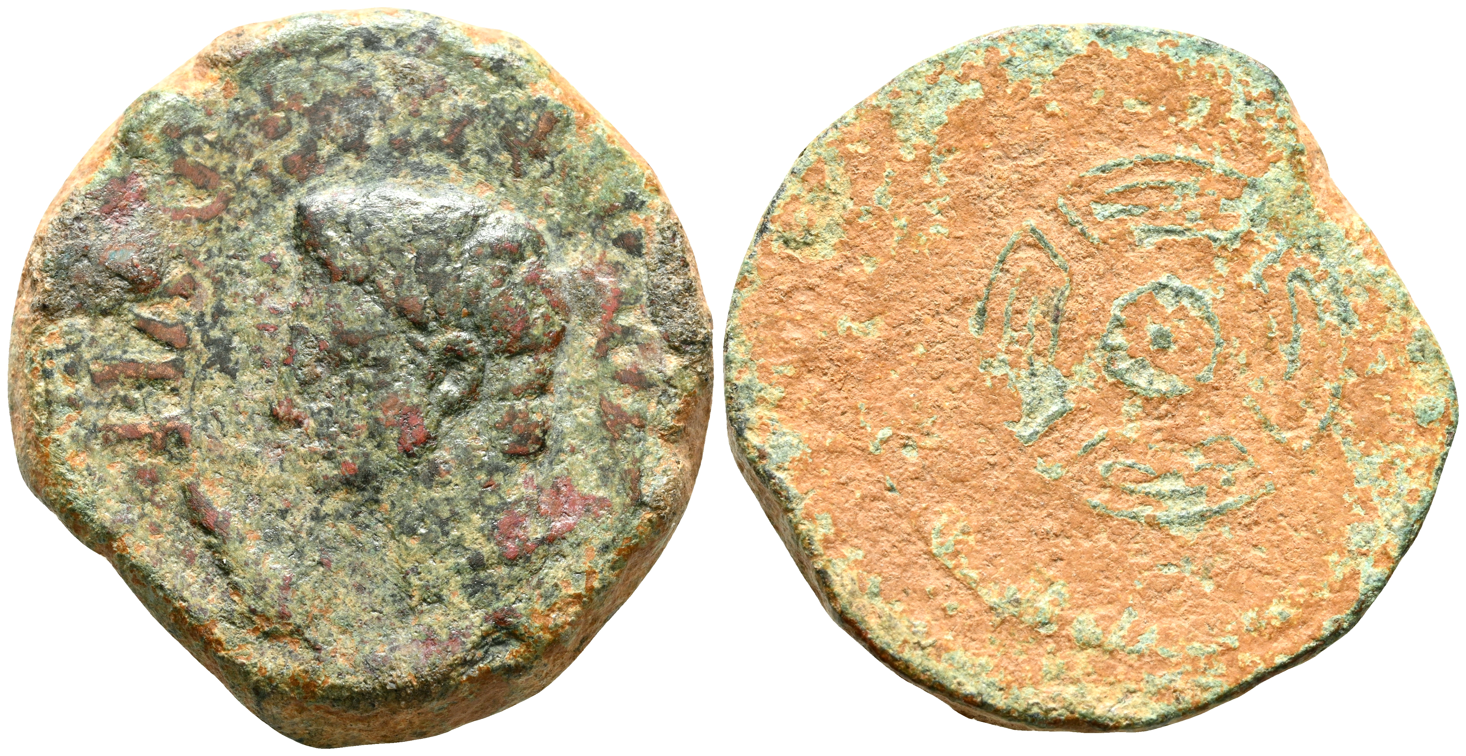 LUCO AUGUSTI (Lugo). As. (Ae. 11,24g/25mm). 27 A.C.-14 d.C. (FAB-1705). Anv: Cabeza de Augusto a izquierda, entre espiga y caduceo, encima leyenda: IMP AVG DIVI F. Rev: Rodela de frente con borde. MBC-. Escasa.