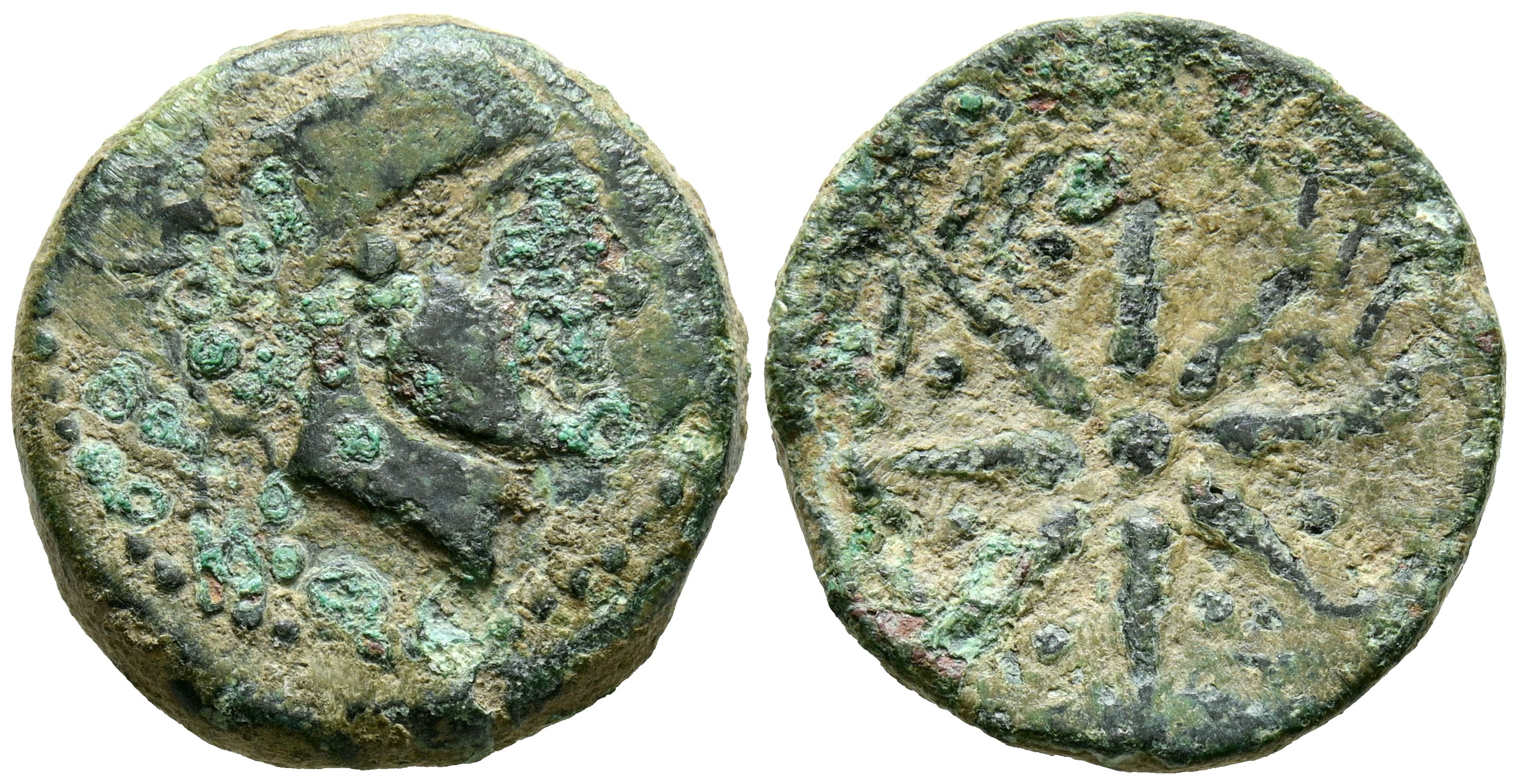 MALACA (Málaga). Semis. (Ae. 7,47g/22mm). 200-20 a.C. (FAB-1733, variante con puntos entre los rayos). Anv: Cabeza de Vulcano a la derecha, detrás de la leyenda púnica y las tenazas. Rev: Estrella dentro de corona de laurel. MBC-. Concreciones.