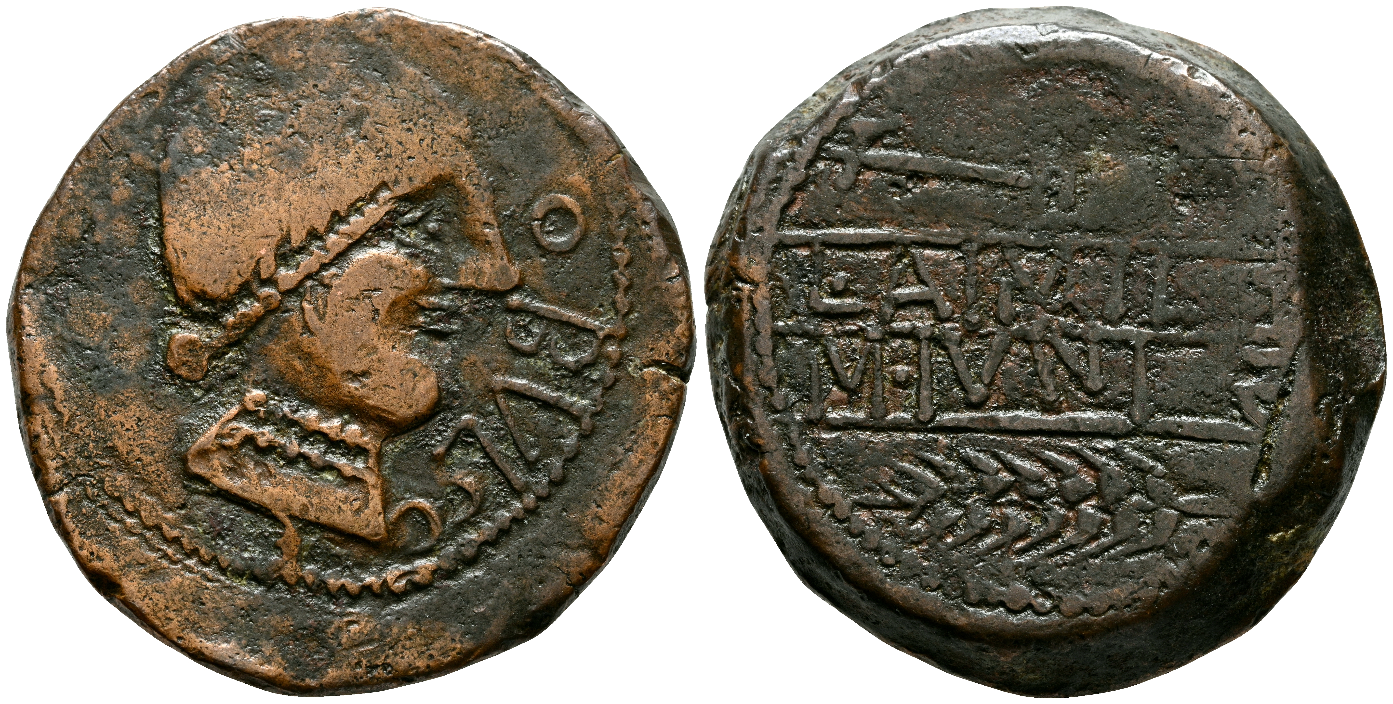 OBULCO (Porcuna, Jaén). As. (Ae. 17,84g/29mm). 220-20 d.C. (FAB-1815). Anv: Cabeza femenina a derecha, delante leyenda externa: OBVLCO, detrás creciente y letra ibérica Ta. Rev: Arado a derecha, debajo espiga a izquierda, entre ellos leyenda: L AIMIL/ M IVNI/ AID. MBC-.