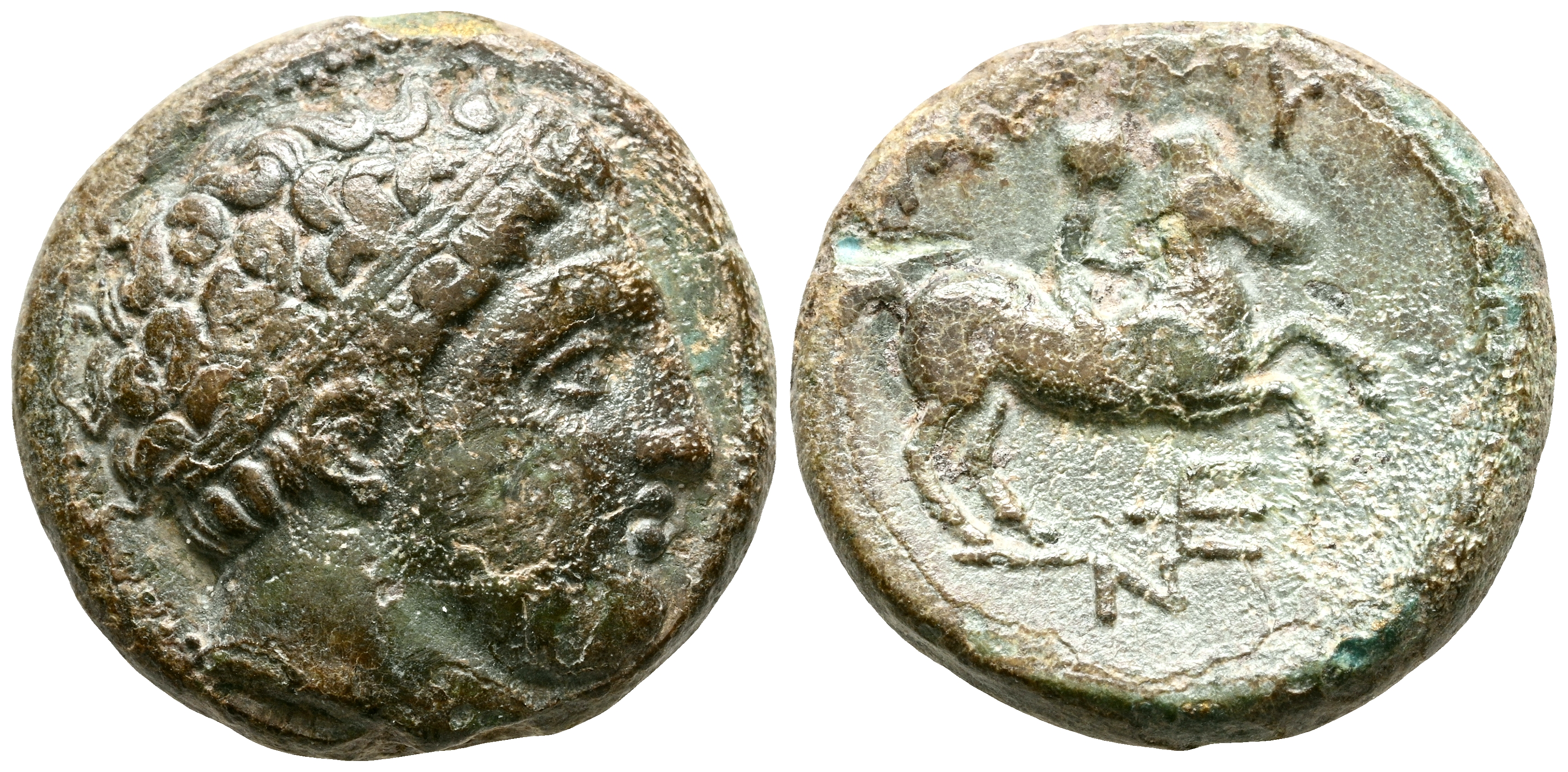 REYES DE MACEDONIA, Filipo II. Ae17. (Ae. 5,32g/17mm). 359-336 a.C. (SNG ANS 905; HGC 3, 882). Anv: Cabeza laureada de Apolo a derecha. Rev: Jinete a caballo a derecha, debajo monograma: NE, encima leyenda griega: ΦΙΛΙΠΠΟΥ. MBC.