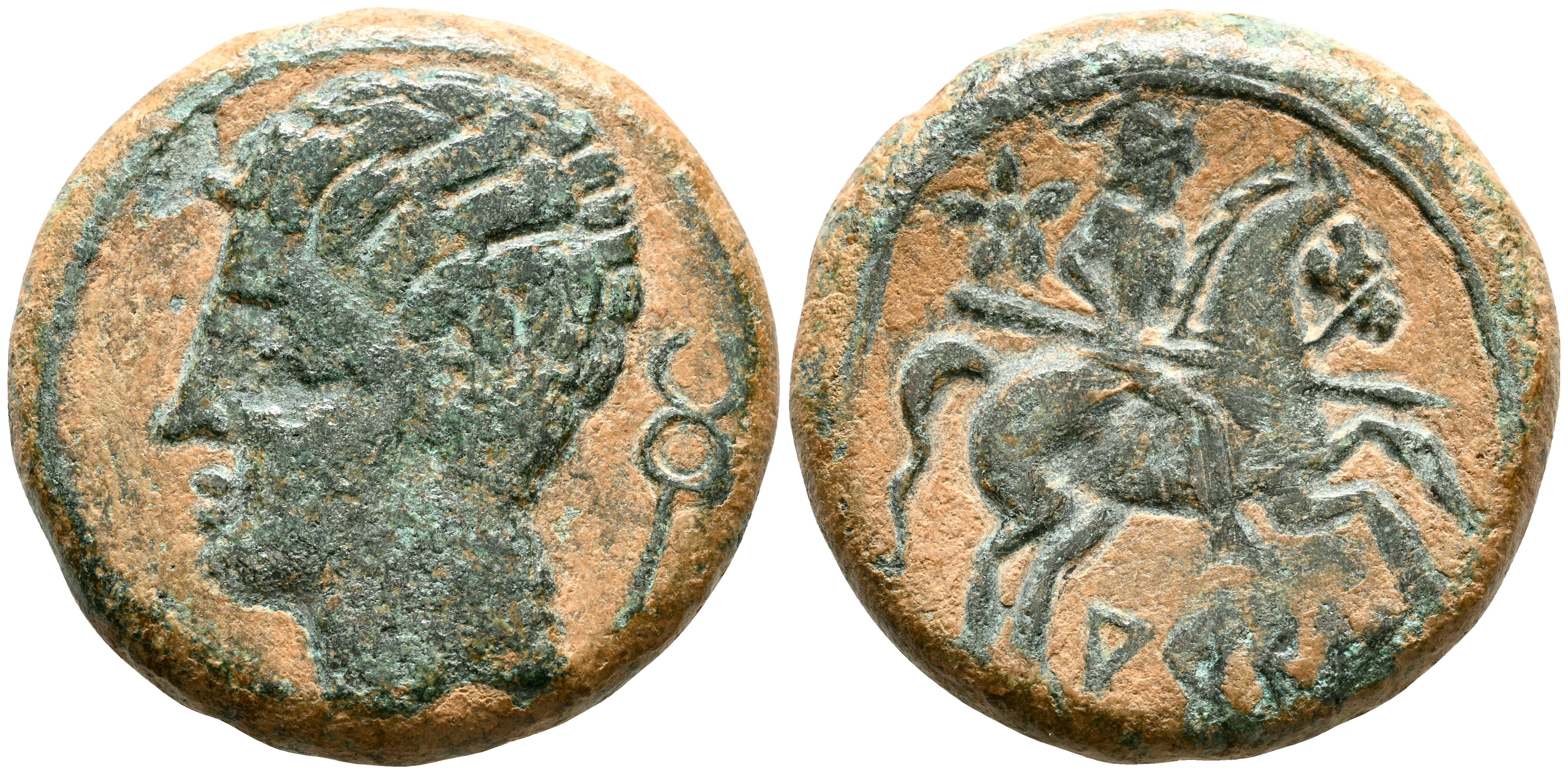 ARSE-SAGUNTO (Sagunto, Valencia). As. (Ae. 14,46g/26mm). 120-100 a.C. (FAB-2073). Anv: Cabeza diademada masculina a izquierda, detrás caduceo. Rev: Jinete con lanza a derecha, encima estrella, debajo leyenda ibérica: ARSE. MBC. Escaso ejemplar. Realzado.