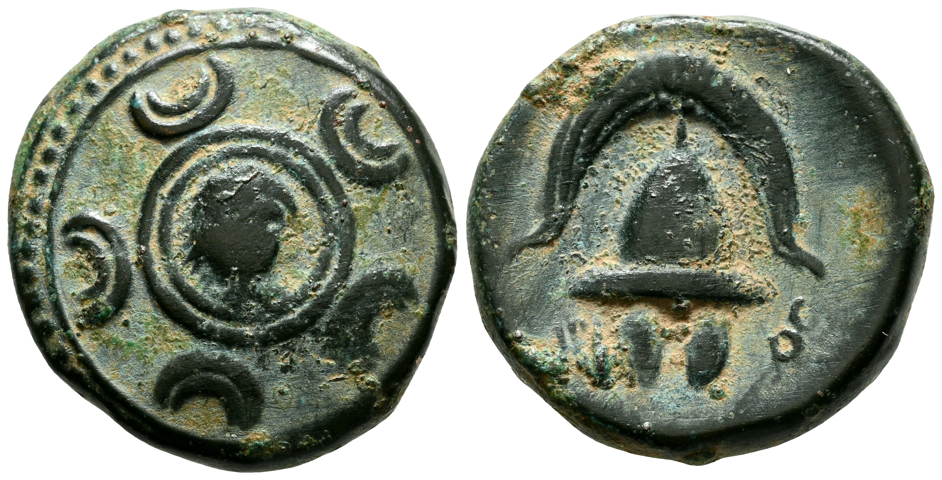 REYES DE MACEDONIA, Filipo III Arrhidaios. Ae16. (Ae. 3,50g/16mm). 323-317 a.C. Ceca incierta del oeste de Asia. (Price 2803). Anv: Cabeza de Heracles con piel de león a derecha dentro de escudo macedonio. Rev: Casco macedonio, a la izquierda monograma griego, a la derecha caduceo. MBC.