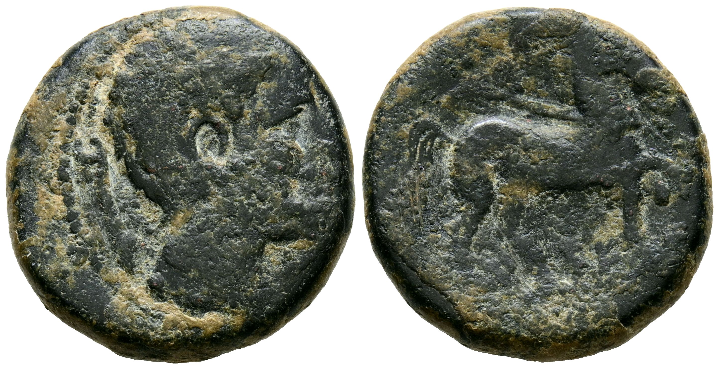 CESE (Tarragona). Semis. (Ae. 6,86g/21mm). 120-20 a.C. (FAB-2306). Anv: Cabeza masculina a derecha, detrás caduceo. Rev: Caballo saltando a derecha, debajo leyenda ibérica CeSE. MBC-.