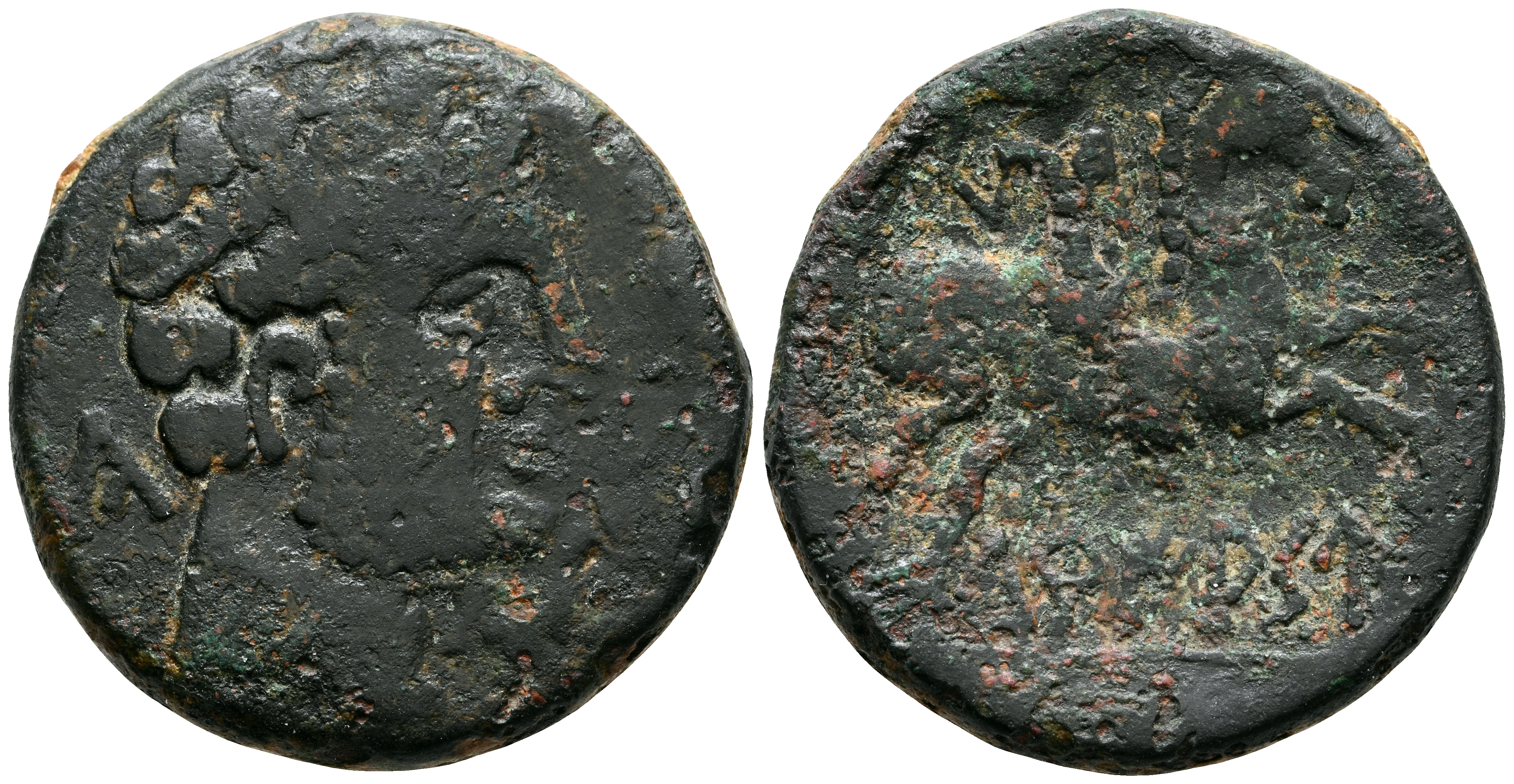 TURIASO (Tarazona, Zaragoza). As. (Ae. 8,59g/22mm). 120-20 a.C. (FAB-2425). Anv: Cabeza masculina barbada a derecha, detrás letra ibérica Ca, delante delfin. Rev: Jinete con gancho a derecha, debajo leyenda ibérica: TuRIASU. MBC-.