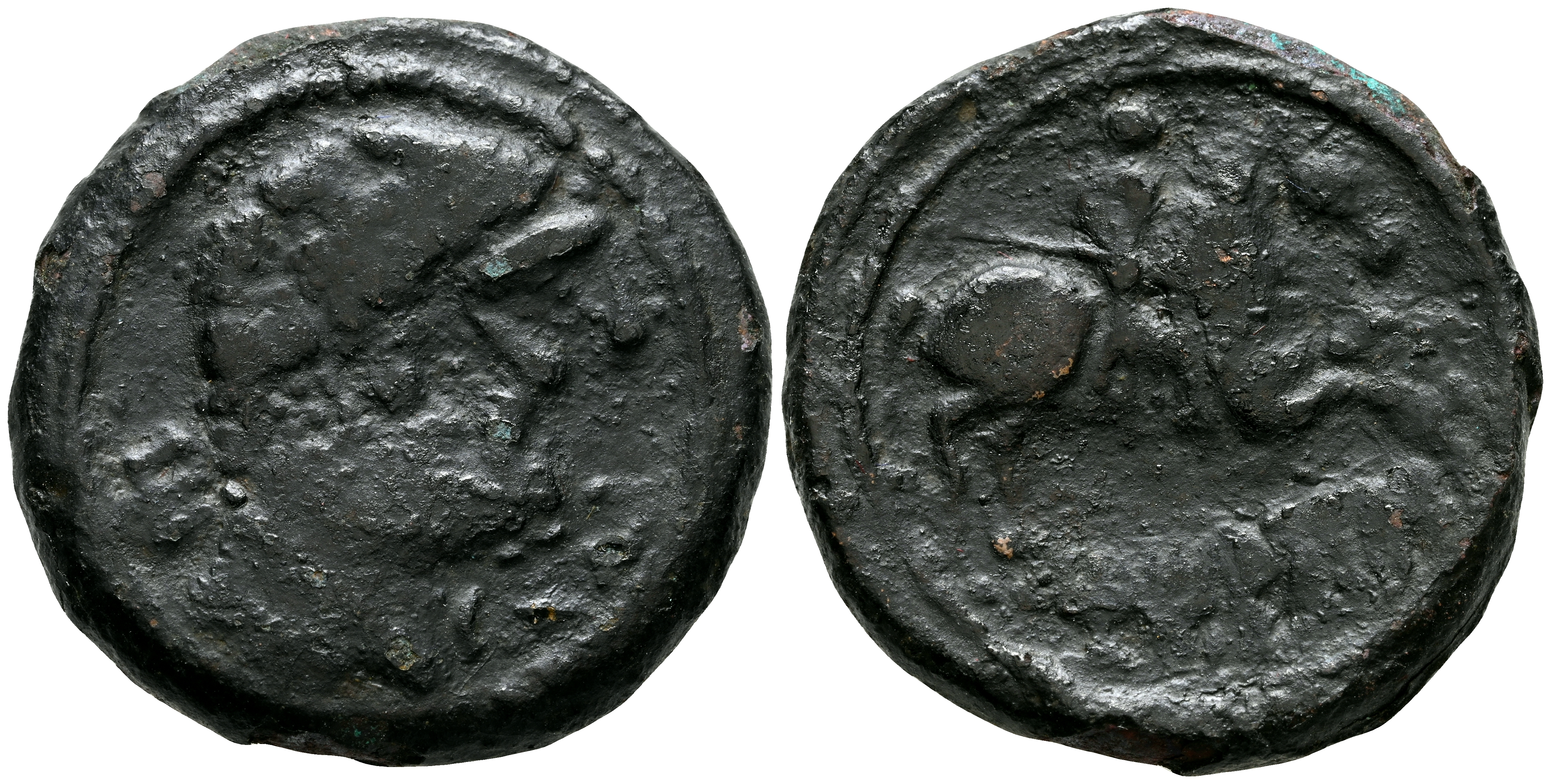 TITIACOS (Tricio, La Rioja). As. (Ae. 11,59g/26mm). 120-20 a.C. (FAB-2394). Anv: Cabeza masculina barbada a derecha, detrás letra ibérica: Ti. Rev: Jinete con lanza a derecha, debajo leyenda ibérica: TiTiACoS. BC+.