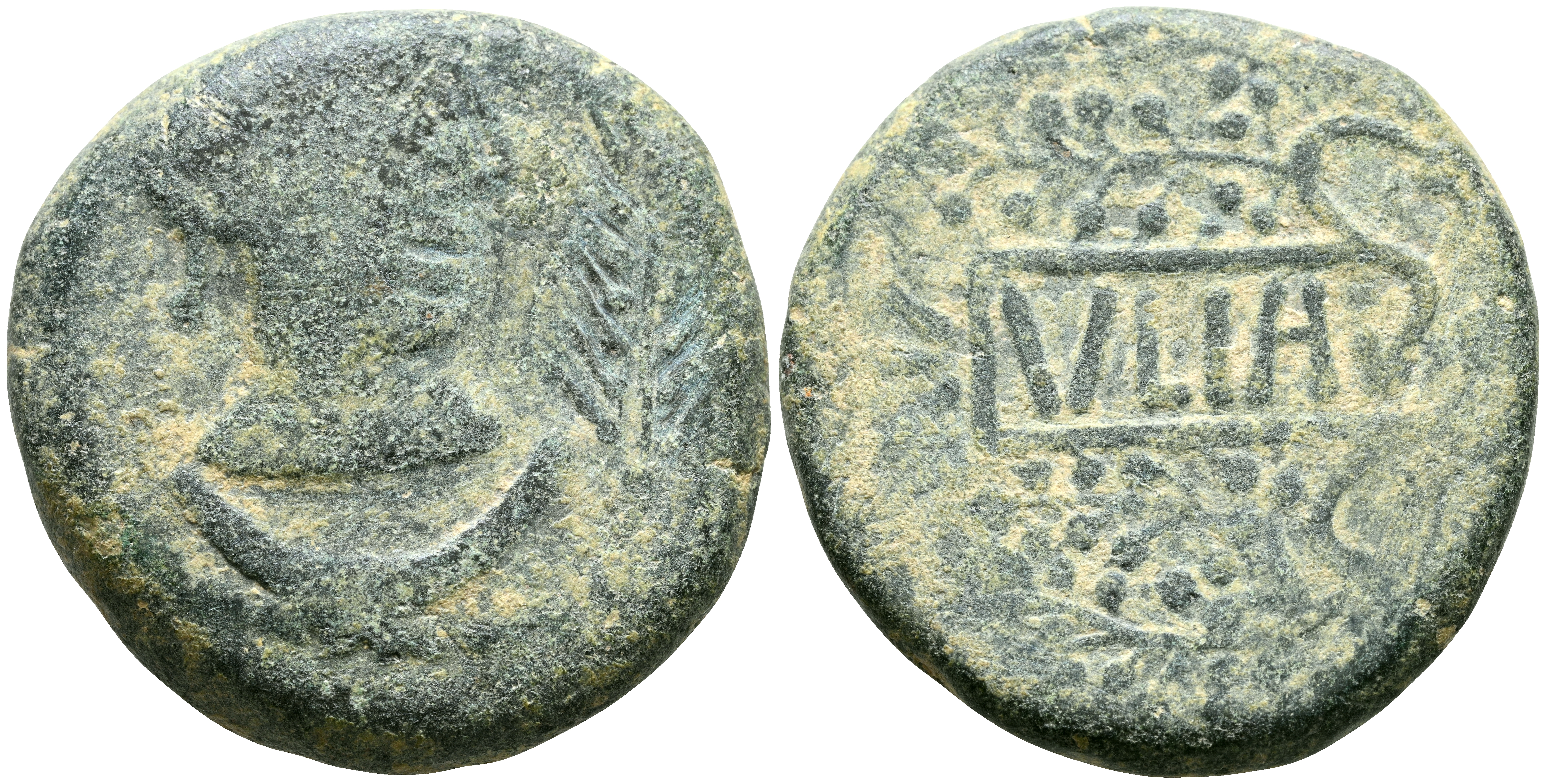 ULIA (Montemayor, Córdoba). As. (Ae. 22,00g/30mm). 50 a.C. (FAB-2490). Anv: Cabeza femenina a derecha, delante palma, debajo creciente. Rev: Ramas de vid alrededor de cartela con leyenda: VLIA. MBC-/MBC.