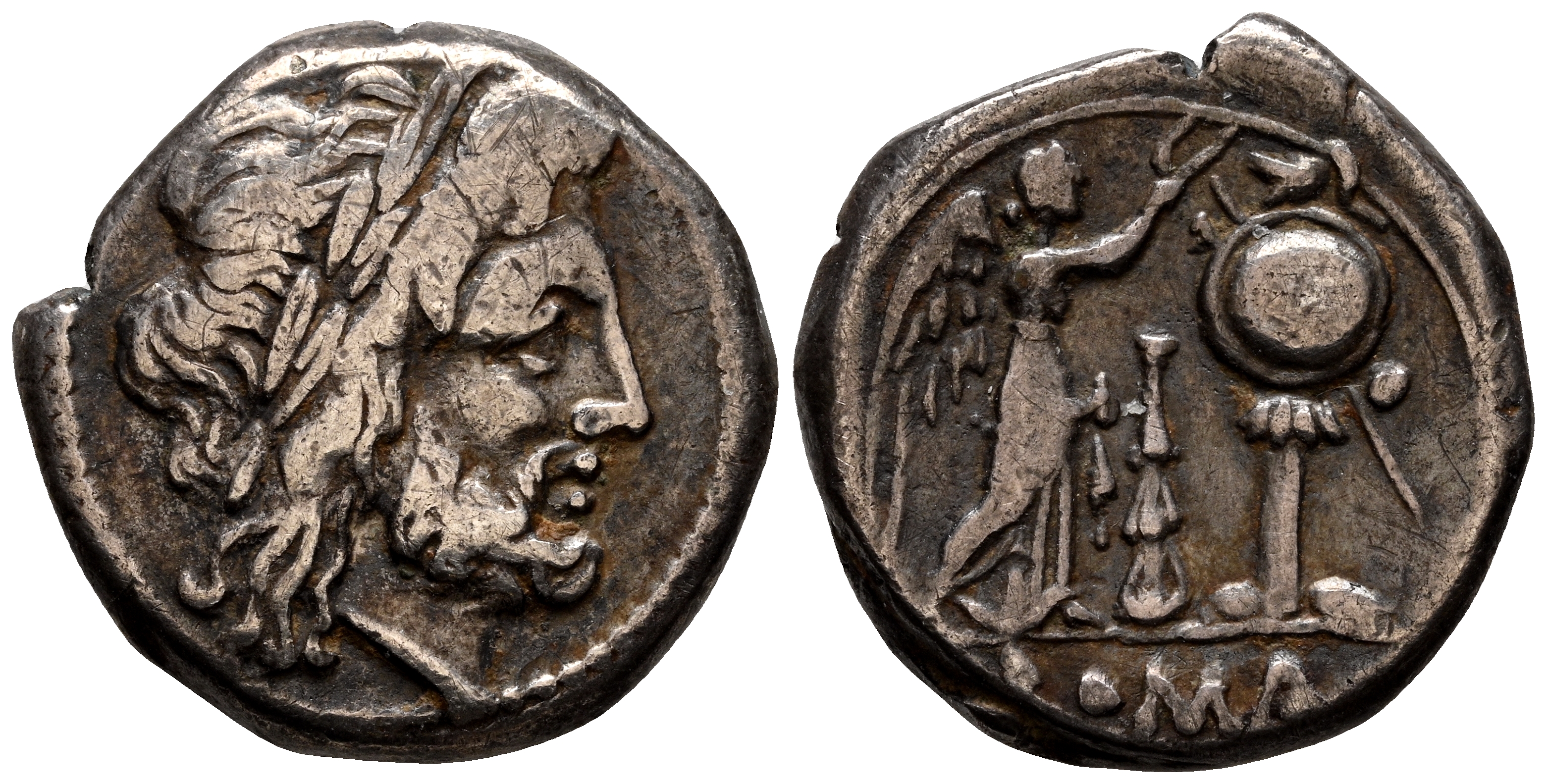 ACUÑACIONES ANÓNIMAS. Victoriato. (Ar. 2,96g/16mm). 209 a.C. Roma. (Crawford 89/1). Anv: Cabeza laureada de Júpiter a derecha. Rev: Victoria estante a derecha coronando trofeo de armas, en medio mazo, en exergo: ROMA. MBC+.