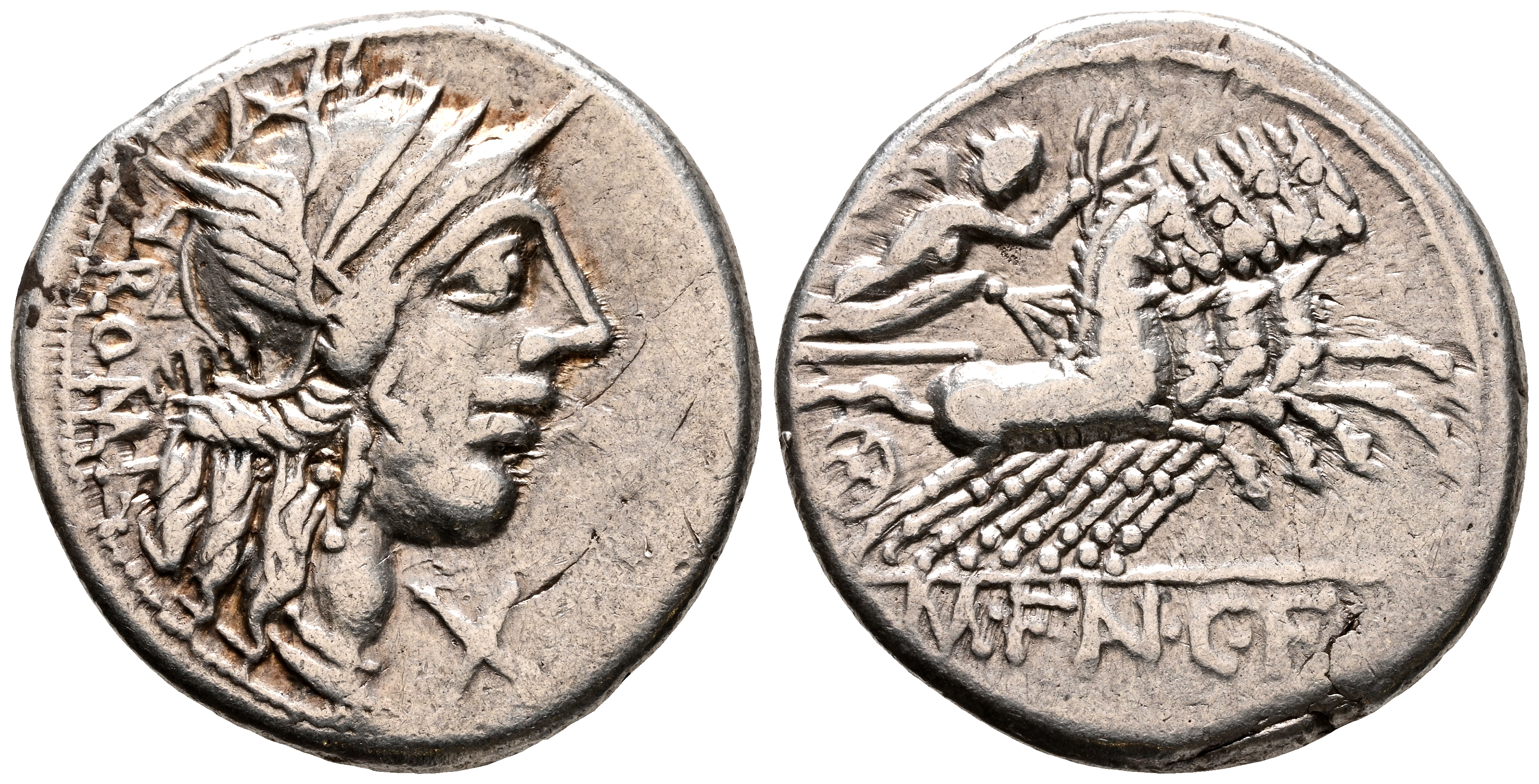 GENS FANNIA. Denario. (Ar. 3,86g/19mm). 123 a.C. Roma. (FFC 705; Crawford 275/1). Anv: Cabeza de Roma a derecha, delante X, detrás leyenda: ROMA. Rev: Victoria con corona en cuádriga a derecha, en exergo: M FAN CF. MBC-.
