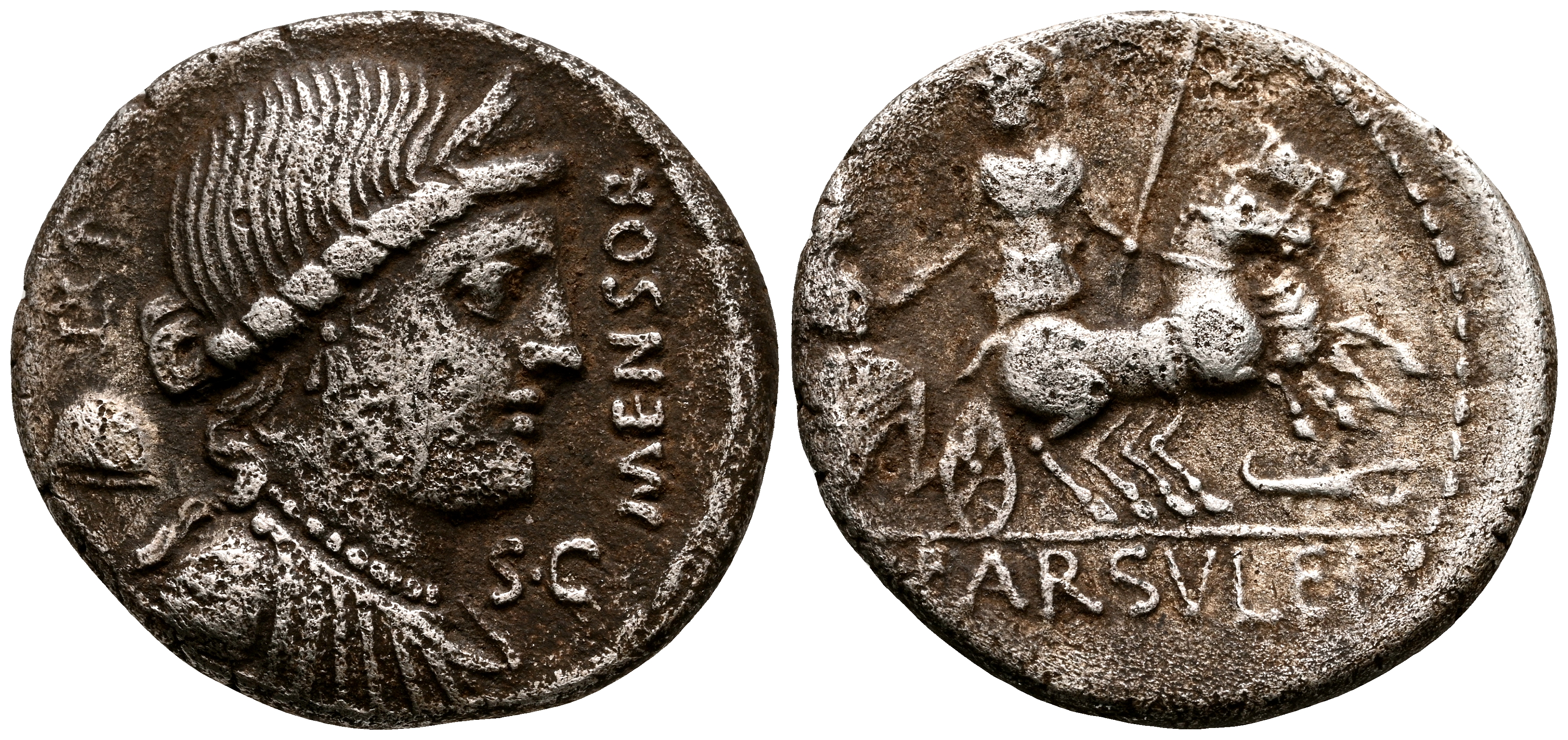 GENS FARSULEIA. Denario. (Ar. 3,71g/18mm). 75 a.C. Roma. (FFC 707; Crawford 392/1a). Anv: Busto diademado de la libertad a derecha, detrás: gorro frigio y XI, delante leyenda: MENSOR, bajo el monton: SC. Rev: Guerrero con lanza en biga a derecha, a su lado otro personaje se dispone a montar sobre el carro, debajo: escorpión, en exergo: L FARSVLEI. MBC. Porosidad.