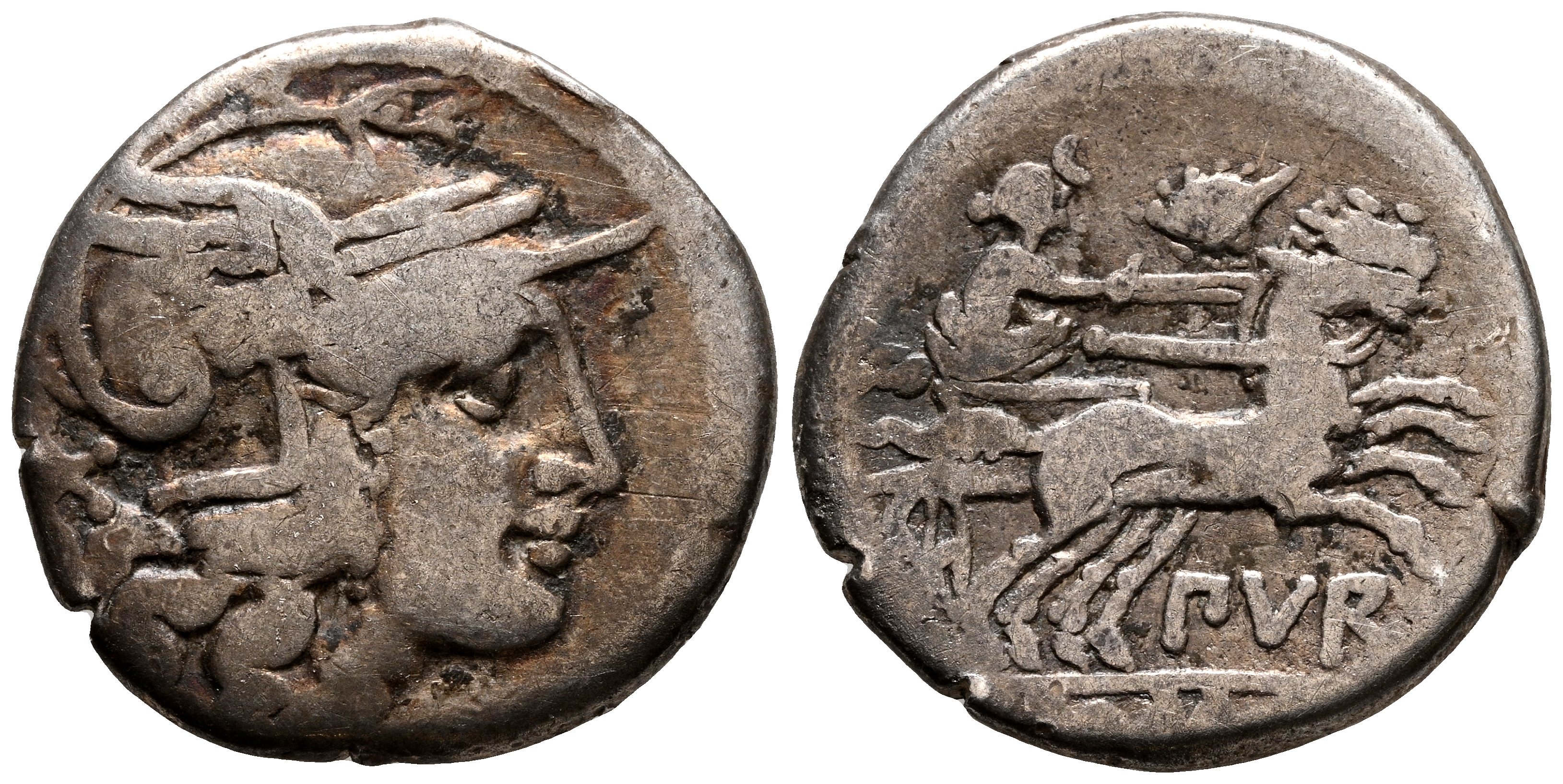 GENS FURIA. Denario. (Ar. 3,57/16mm). 169-158 a.C. Taller auxiliar de Roma. (FFC 729; Crawford 187/1). Anv: Cabeza de Roma a derecha, detrás X. Rev: Diana en biga a derecha en el campo murex, debajo leyenda: PVR, en exergo: ROMA. BC+.