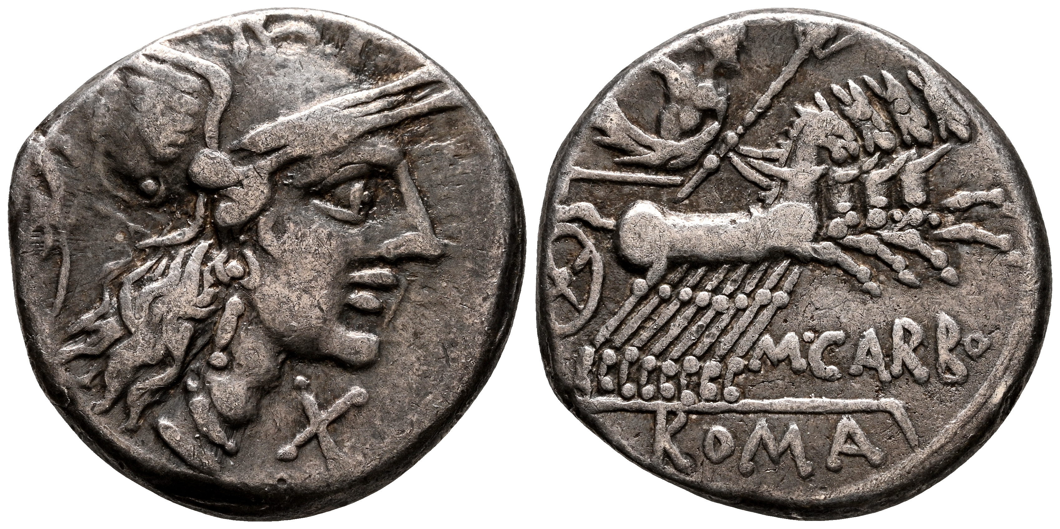 GENS PAPIRIA. Denario. (Ar. 3,85g/17mm). 122 a.C. Auxiliar de Roma más alto. (FFC 959; Crawford 276/1). Anv: Cabeza de Roma con casco a derecha, detrás: rama de laurel, delante: X. Rev: Júpiter con cetro y haz de rayos conduciendo cuádriga a derecha, debajo leyenda: M CARBO, en exergo: ROMA. MBC.