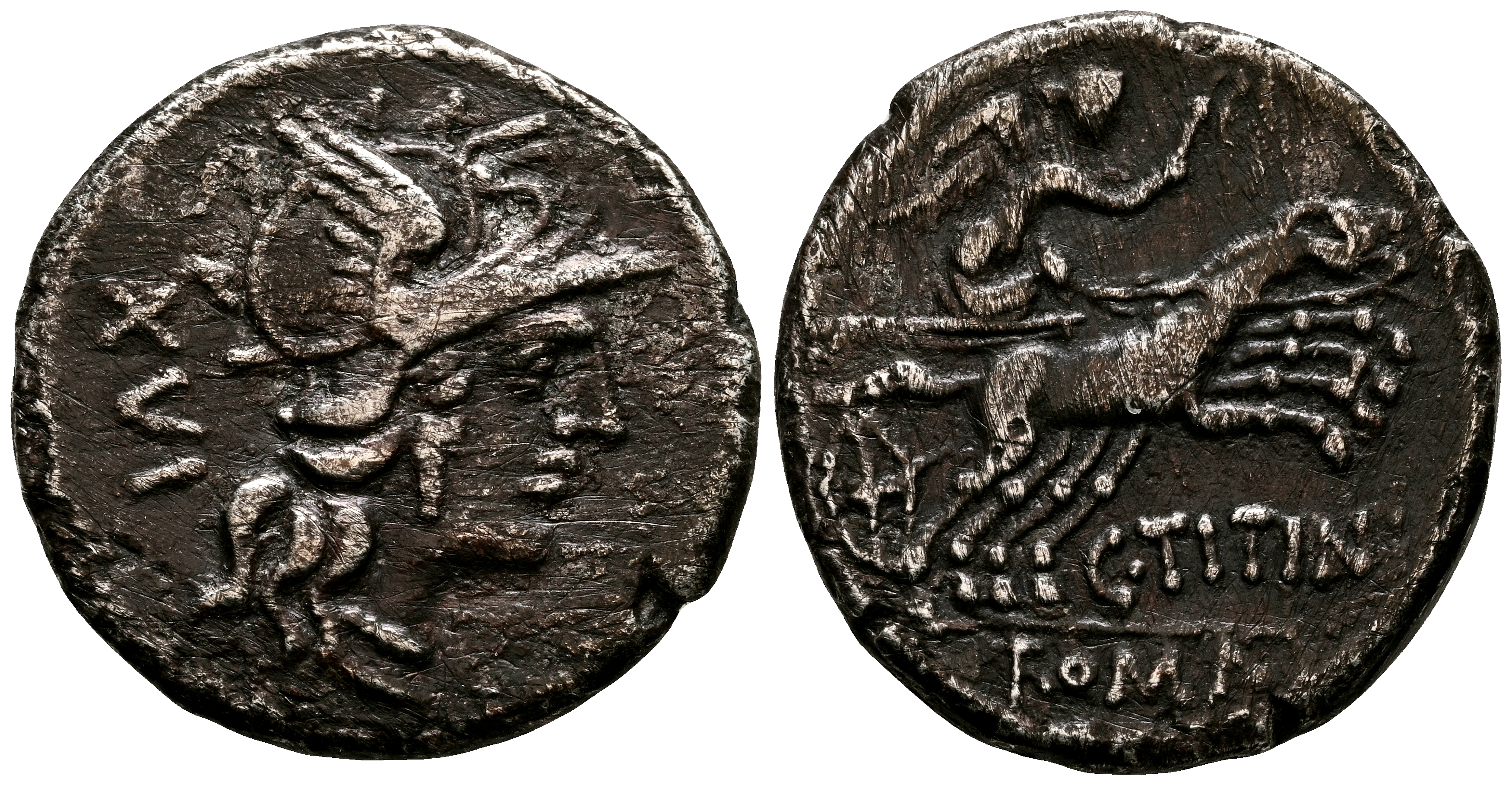 GENS TITINIA. Denario. (Ar. 3,54g/18mm). 141 a.C. Roma. (FFC 1146; Crawford 226.1). Anv: Cabeza de Roma a derecha, detrás: XVI. Rev: Victoria conduciendo biga con látigo, debajo: C TITINI, en exergo: ROMA. MBC. Escaso ejemplar.