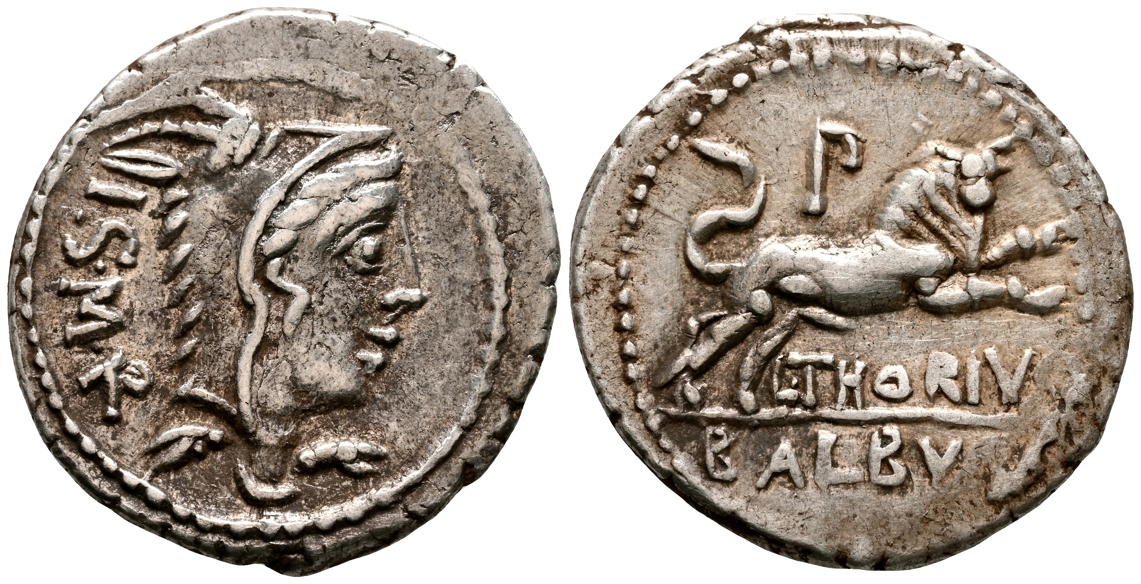 GENS THORIA. Denario (Ar. 3,98g/20mm). 105 a.C. Roma. (FFC 1141; Crawford 316/1). Anv: Busto de Juno Sospita a derecha, cubierta con piel de cabra, detrás ISMR. Rev: Toro a derecha con las patas delanteras levantadas, encima: P y debajo: L THORIVS, en el exergo: BALBVS. MBC+.