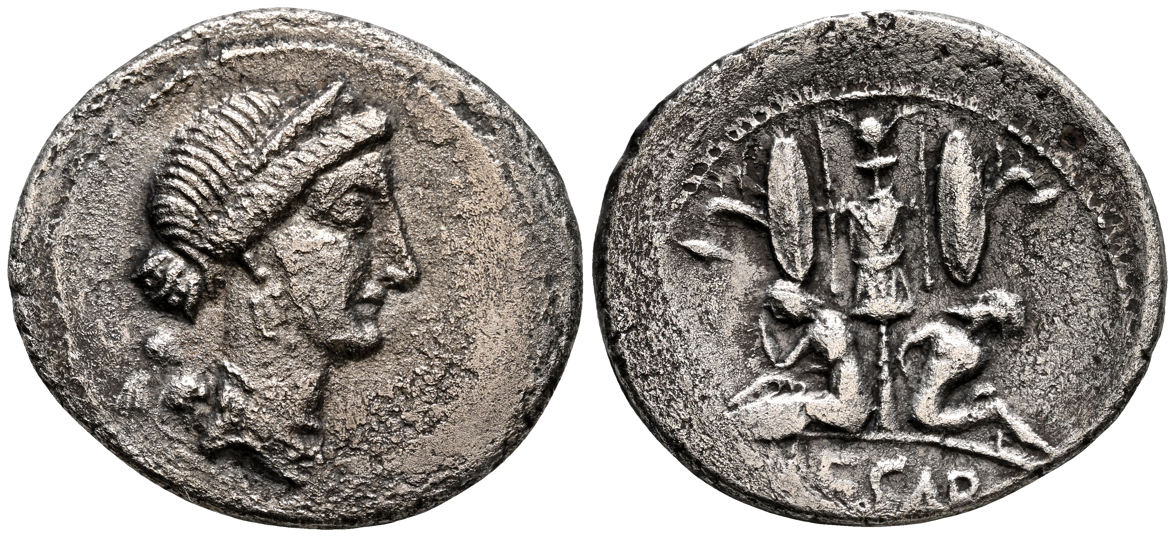JULIO CESAR. Denario. (Ar. 3,33g/20mm). 46-45 d.C. Ceca militar móvil en la Península Ibérica. (Crawford 468/1; FFC 11). Anv: Cabeza diademada de Venus a derecha, detrás cupido. Rev: Trofeo de armas entre Galia sentada a izquierda y Vercingétorix sentado a derecha, en exergo: CAESAR. MBC. Porosidad.