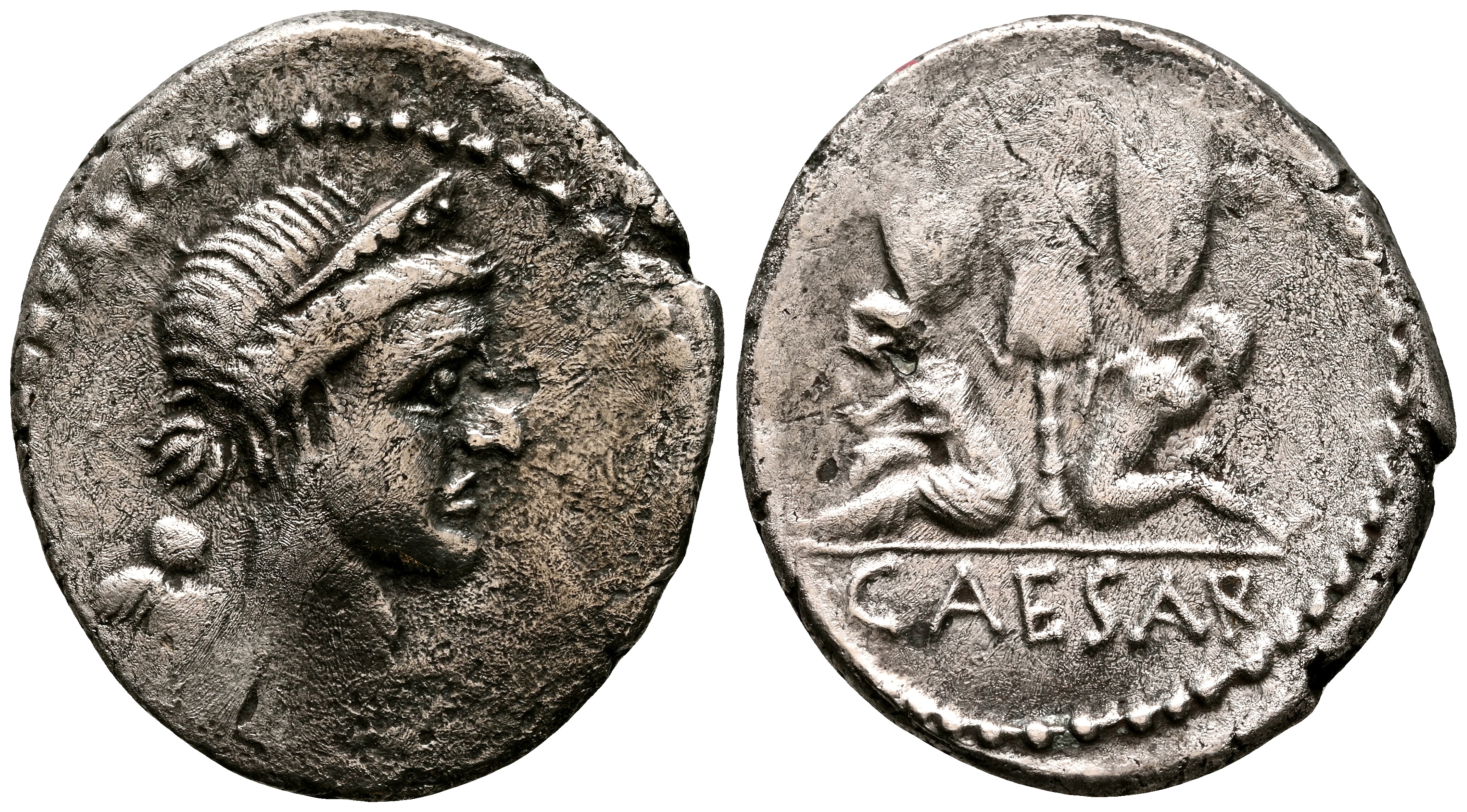 JULIO CESAR. Denario. (Ar. 3,59g/20mm). 46-45 a.C. Ceca militar móvil en la Península Ibérica. (FFC 11; Crawford 468/1). Anv: Cabeza diademada de Venus a derecha, detrás cupido. Rev: Trofeo de armas entre Galia sentada a izquierda y Vercingetorix sentado a derecha, en exergo: CAESAR. MBC-. Escaso ejemplar.