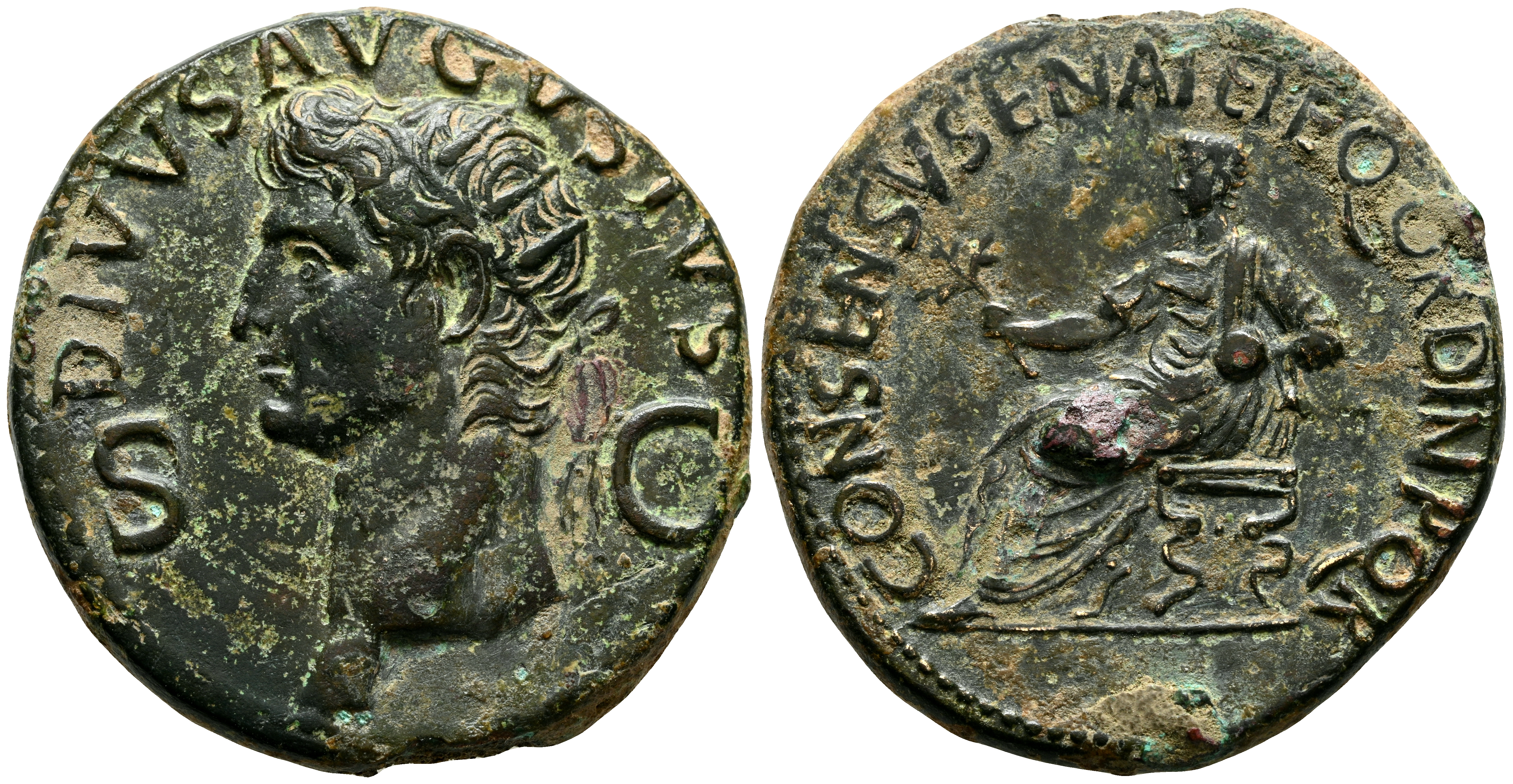 DIVO AUGUSTO. Dupondio. (Ae. 12,88g/28mm). 14 d.C. Roma. (RIC 56). Anv: Cabeza radiada de Augusto a izquierda, entre: S-C, encima leyenda: DIVVS AVGVSTVS. Rev: Augusto sentado a izquierda en silla curul portando rama, alrededor leyenda: CONSENSVS SENAT ET EQ ORDIN P Q R. MBC+.