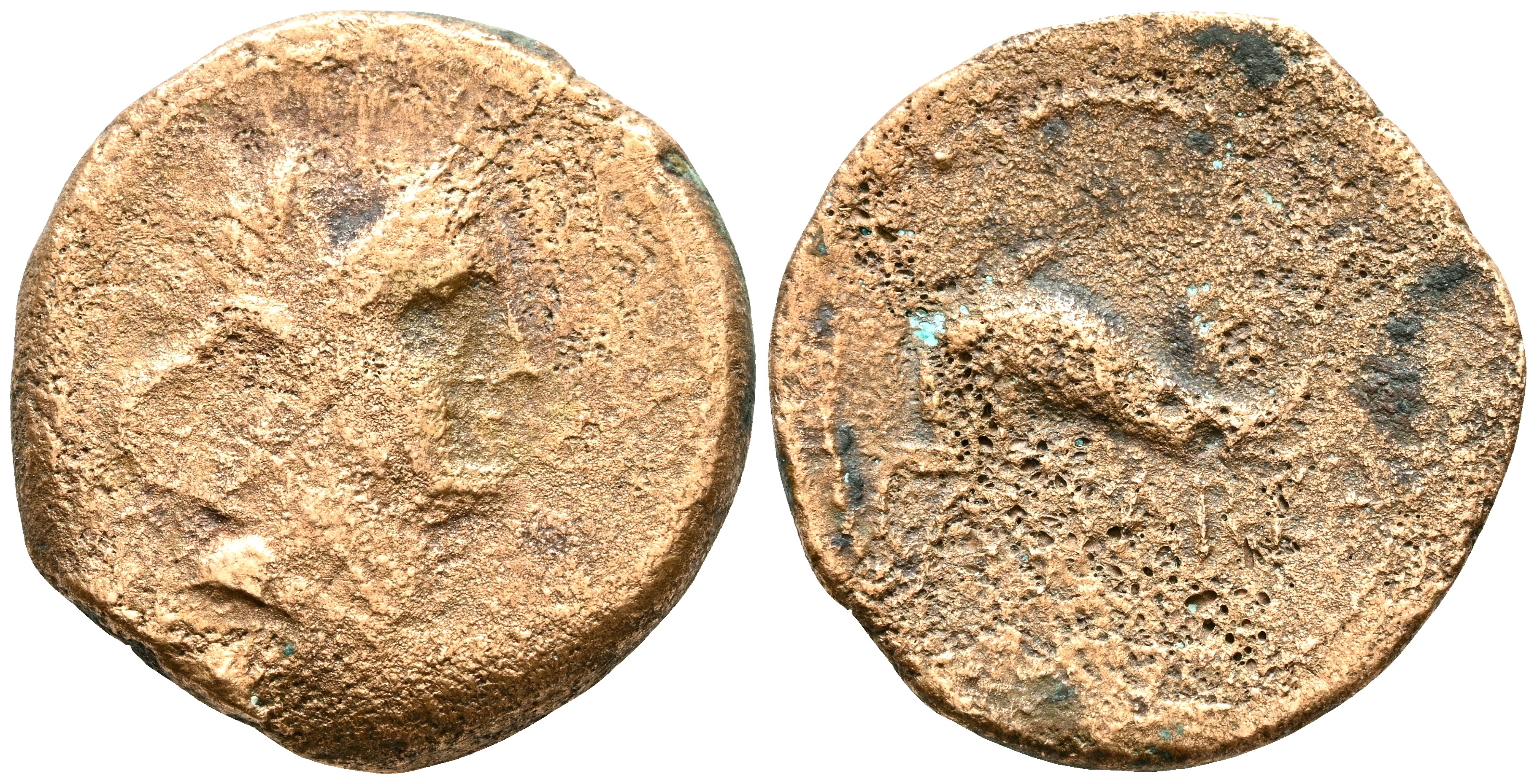REYES DE MAURITANIA, Juba II. Ae19 (Ae. 3,55g/19mm). 25 a.C.-23 d.C. Cesarea. (Mazard 566; RPC 881; SNG Copenhagen 691). Anv: Busto drapeado de África a derecha con piel de elefante. Rev: Delfín a la izquierda, debajo: CAESARE. MBC-/BC+. Porosidad. Limpiada.