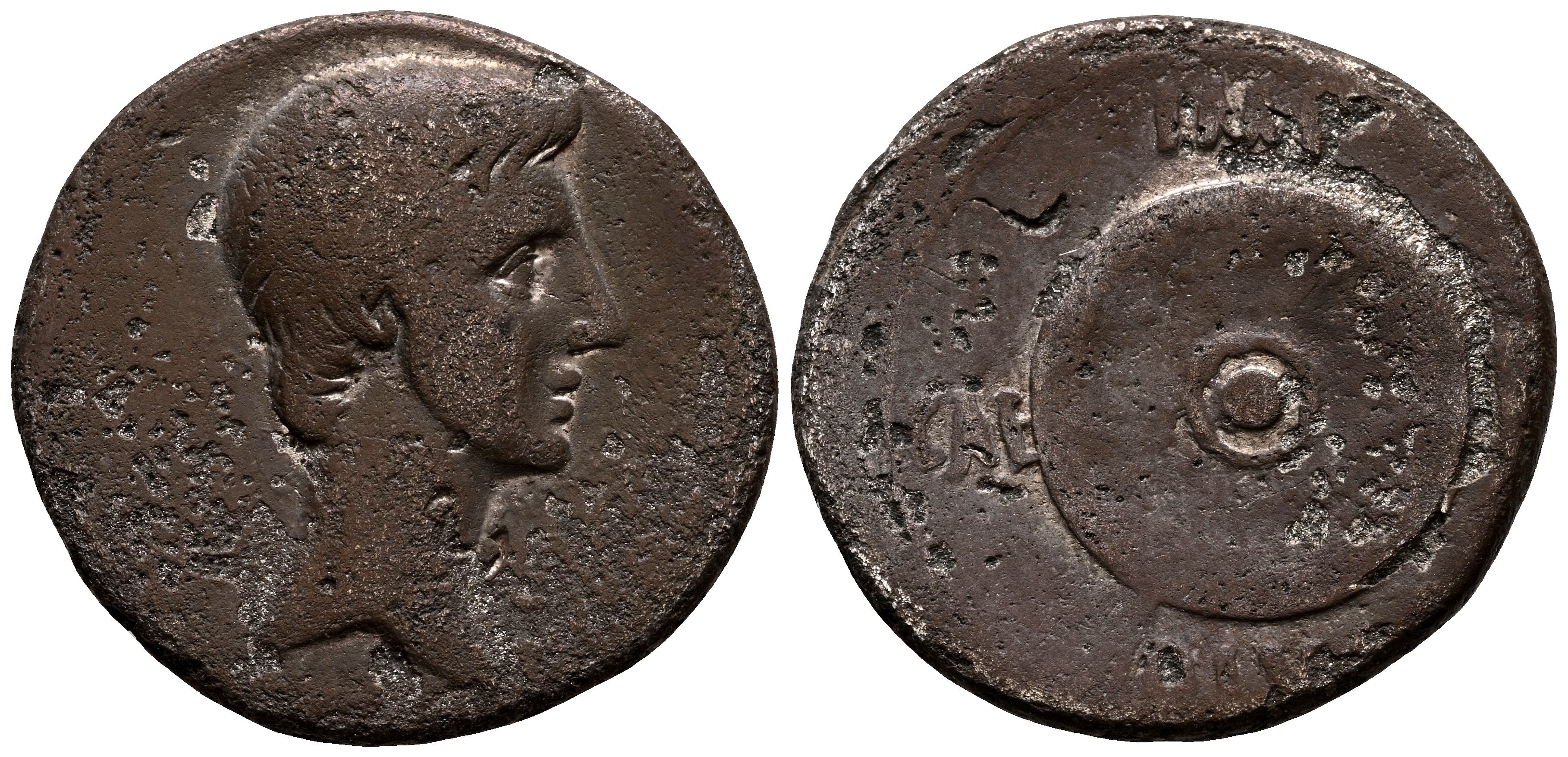 AUGUSTO. Denario. (Ar. 3,50g /18mm). 31 a.C. Kyrenaica. (RIC 543a). Anv: Cabeza desnuda de Augusto a derecha. Rev: Escudo redondo, encima: IMP, debajo: DIVI F, a izquierda: CAE, a derecha: SAR. BC+.