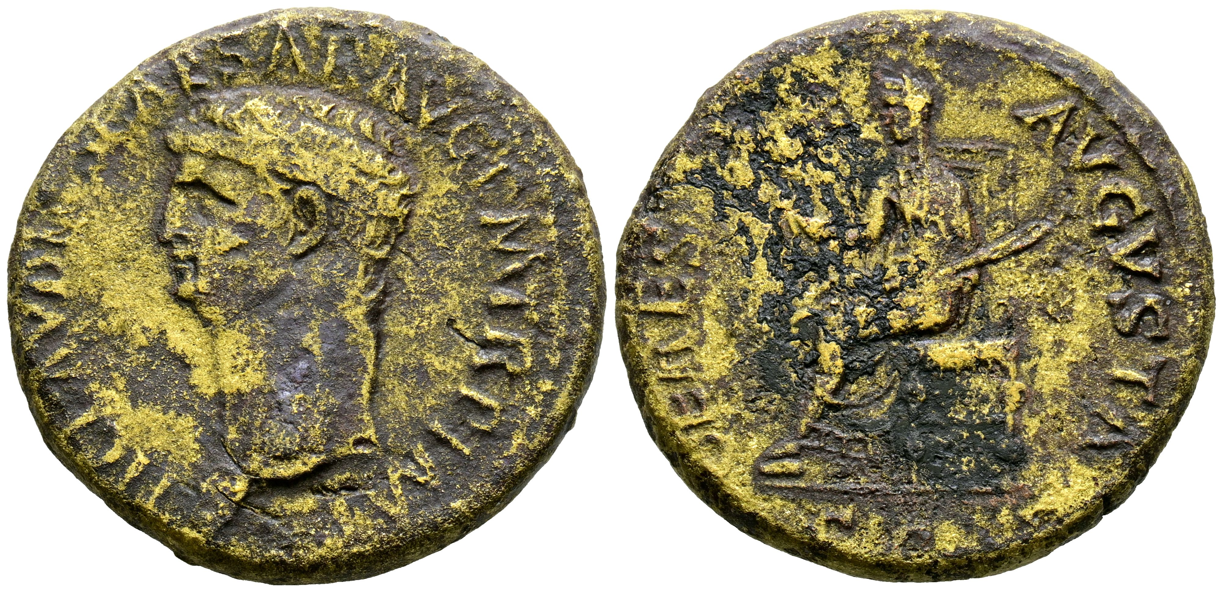 CLAUDIO. As. (Ae. 13,70g/28mm). 41-50 d.C. Roma. Anv: Busto desnudo de Claudio a izquierda, alrededor leyenda: TI CLAVDIVS CAESAR AVG P M TR P IMP. Rev: Ceres sentada a derecha sosteniendo espiga y antorcha, en exergo: SC, alrededor leyenda: CERES AVGVSTI. MBC-. Limpiada.