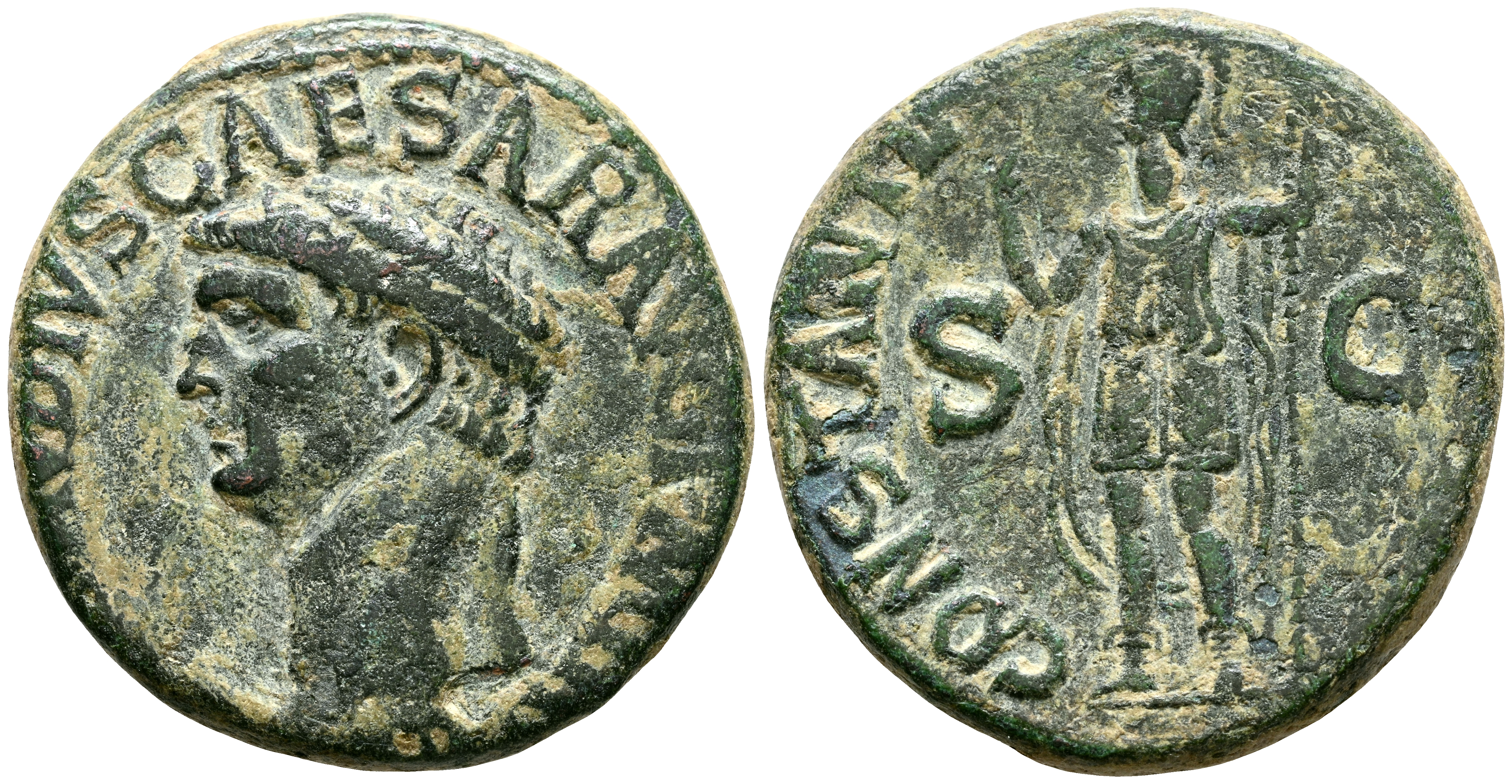CLAUDIO I. As. (Ae. 10,80g/26mm). 41-43 d.C. Roma. (RIC 111). Anv: Cabeza de Claudio I a izquierda, alrededor leyenda: TI CLAVDIVS CAESAR AVG P M TR P IMP. Rev: Constantia estante a izquierda sosteniendo cetro, entre S-C, alrededor leyenda: CONSTANTIAE AVGVSTI. MBC.