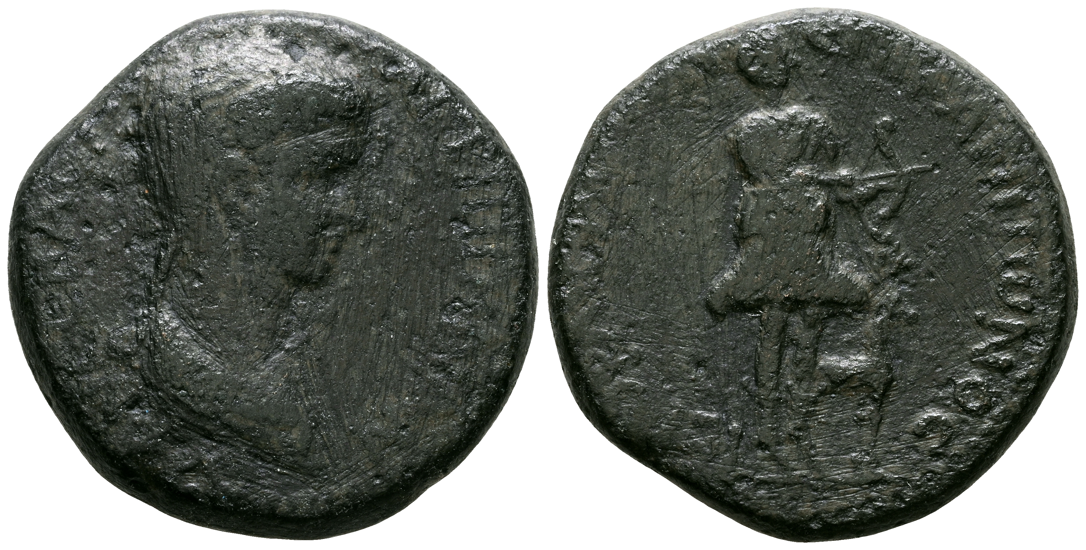 AGRIPINA II. Ae18. (Ae. 4,24g/18mm). 50-59 d.C. Lidia, Hierocaesarea. (RPC 2388; SNG von Aulock 2959). Anv: Busto drapeado de Agripina II a derecha, alrededor leyenda: AΓPIΠΠINAN ΘЄAN CЄBACTHN. Rev: Artemisa estante a derecha, cargando su arco, a sus pies un ciervo estente a derecha, alrededor leyenda: IЄPOKAICAPЄωN ЄΠI KAΠITωNOC. MBC-.