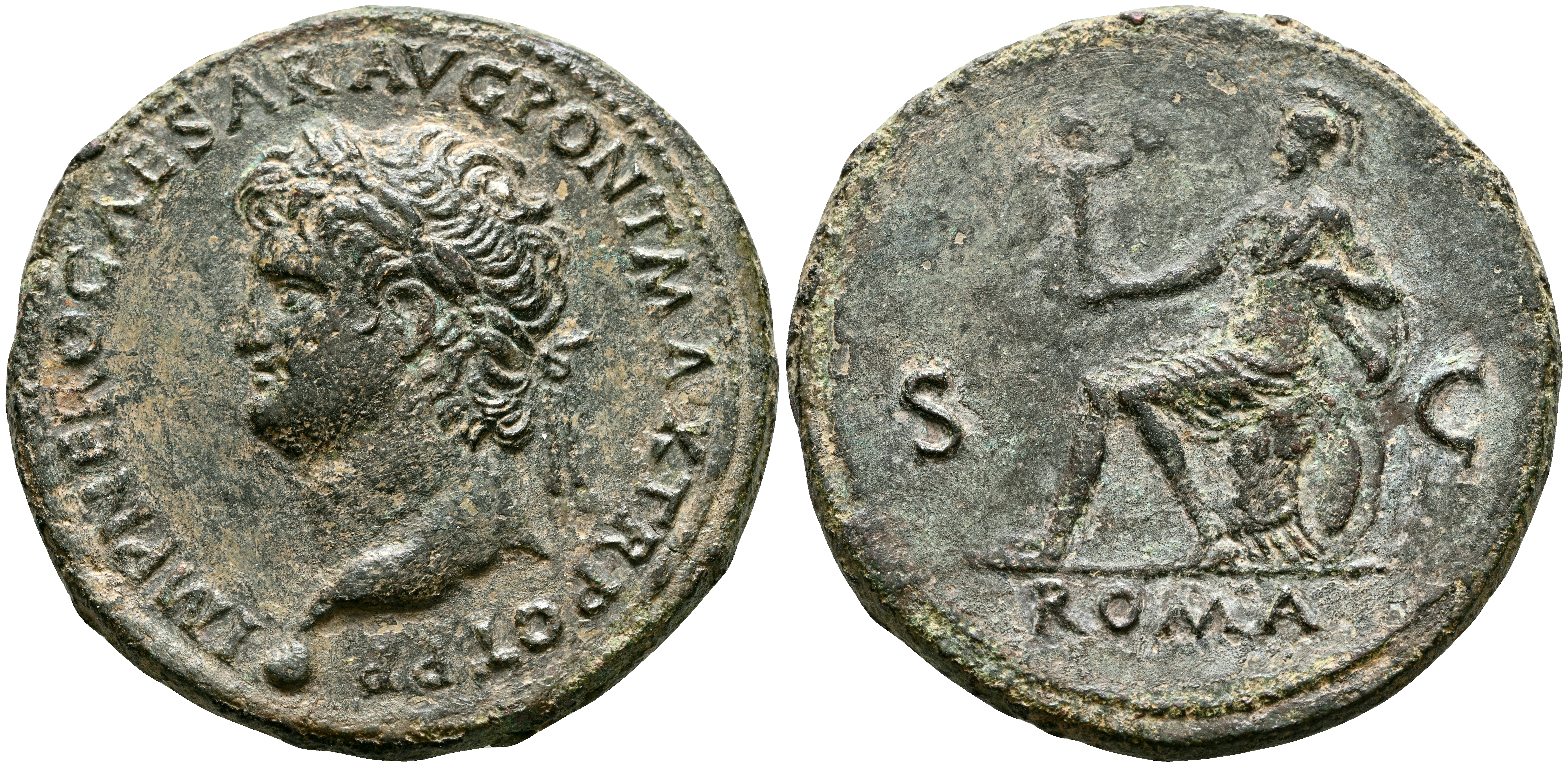 NERON. Sestercio. (Ae. 22,80g/36mm). 62-68 d.C. Lugdunum. (RIC 517). Anv: Cabeza laureada de Nerón a derecha, alrededor leyenda: IMP NERO CAESAR AVG PONT MAX TR POT P P. Rev: Roma sentada a izquierda sobre coraza portando Victoria con corona de laurel y parazonium, entre: S-C, en exergo: ROMA. MBC.