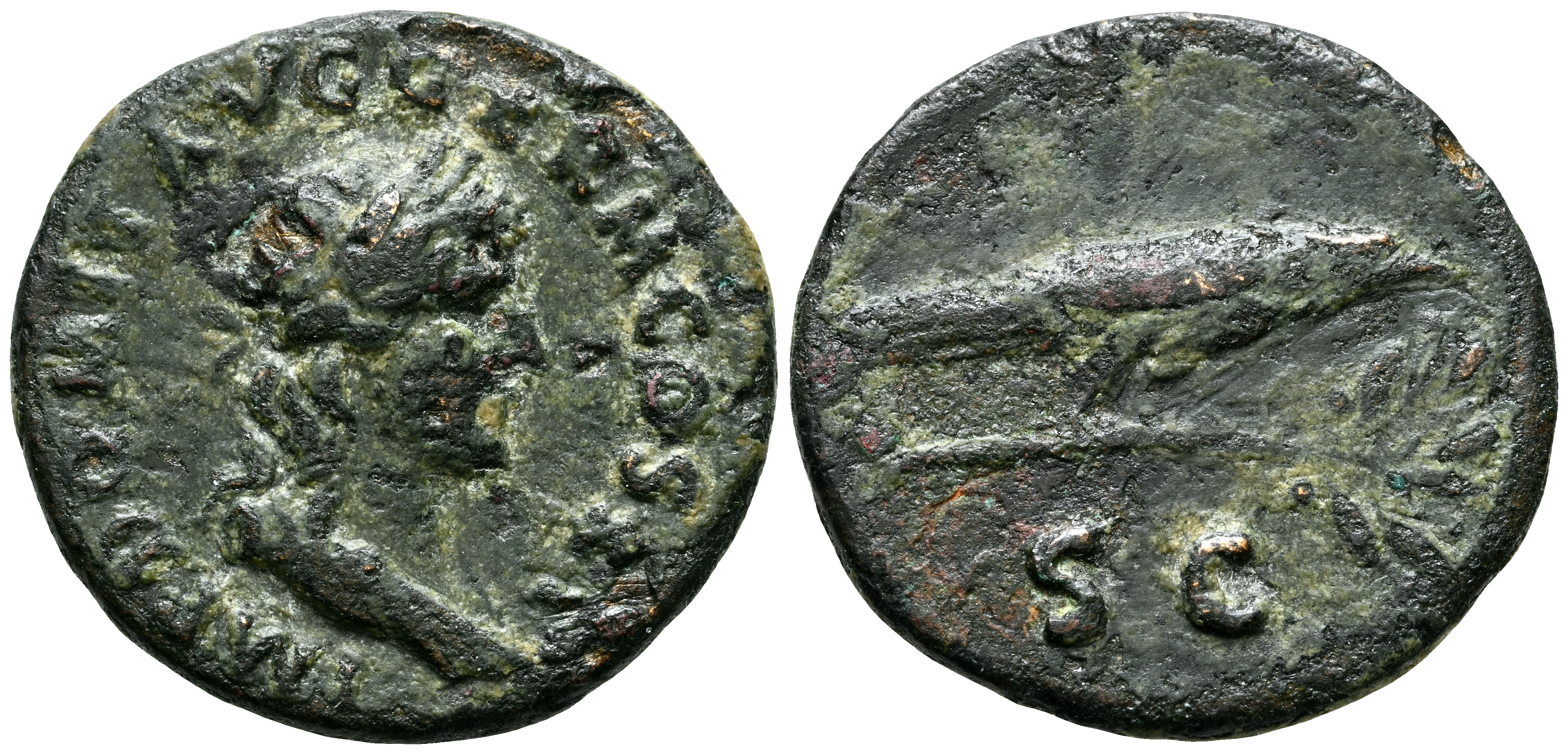 DOMICIANO. Semis. (Ae. 3,59g/20mm). 90-91 d.C. Roma. (RIC 275). Anv: Busto laureado de Apolo a derecha, alrededor leyenda: IMP DOMIT AVG GERM COS XV. Rev: Cuervo a derecha sobre una rama de laurel, debajo: SC. MBC.