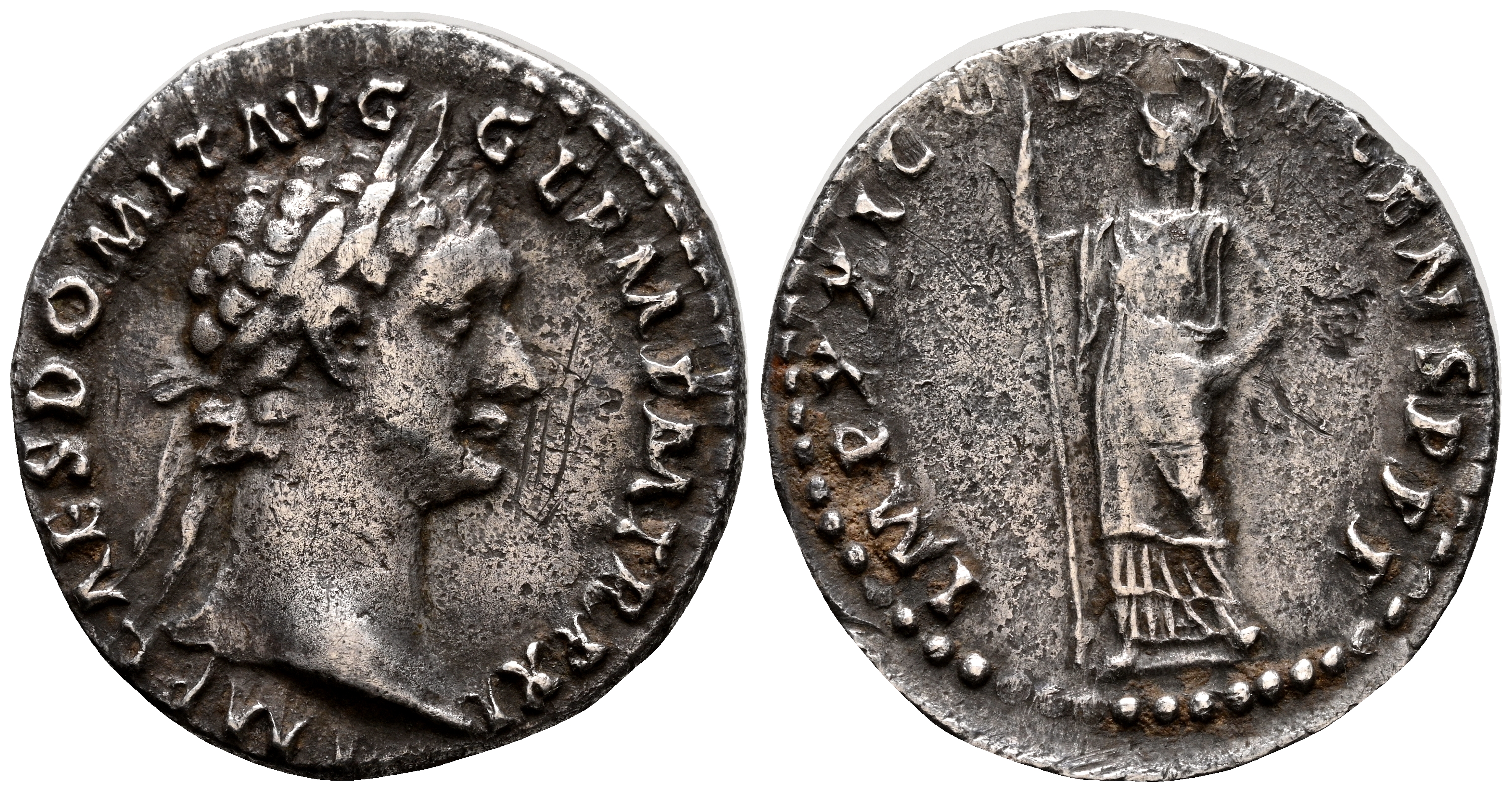 DOMICIANO. Denario. (Ar. 3,09g/19mm). 92 d.C. Roma. (RIC 733). Anv: Cabeza laureada de Domiciano a derecha, alrededor leyenda: IMP CAES DOMIT AVG GERM P M TR P XI. Rev: Minerva estante a izquierda portando lanza, alrededor leyenda: IMP XXI COS XVI CENS P P P. MBC.