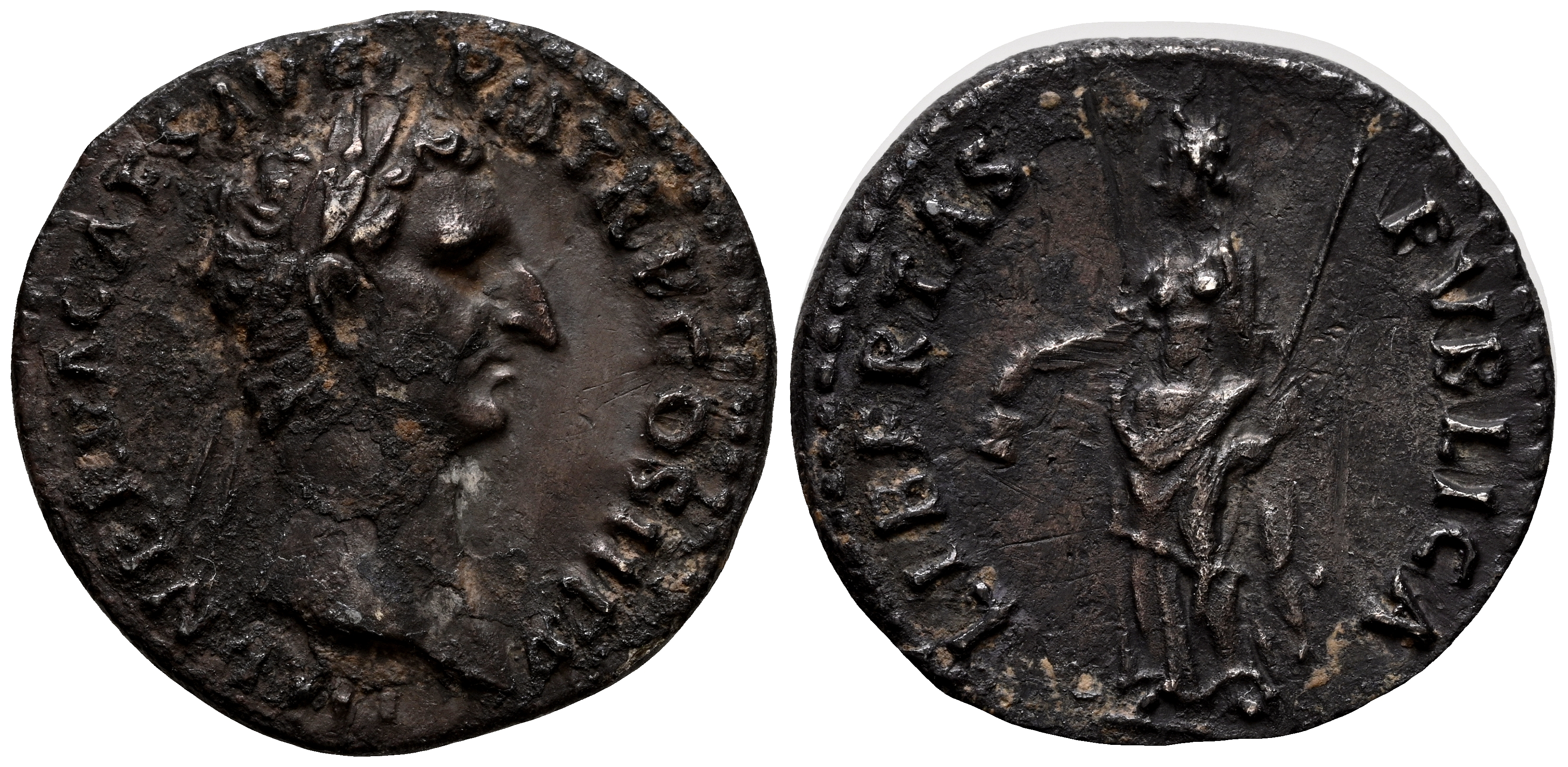NERVA. Denario. (Ar. 2,93g/18mm). 96 d.C. Roma. (RIC 31). Anv: Cabeza de Nerva laureada a derecha, alrededor leyenda: IMP NERVA CAES AVG P M TR P COS III P P. Rev: Libertas estante a izquierda portando píleo y cetro, alrededor leyenda: LIBERTAS PVBLICA. MBC+.