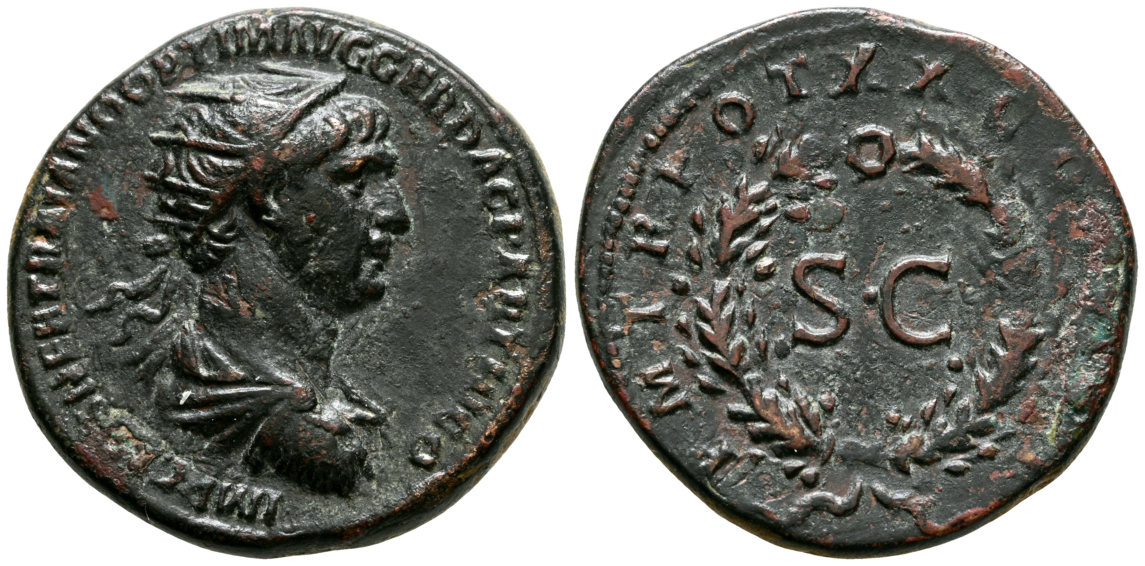 TRAJANO. Semis. (Ae. 4,94g/20mm). 116 d.C. Roma. Acuñada para su circulación en el Este. (RIC 645). Anv: Busto radiado y drapeado de Trajano a derecha, alrededor leyenda: IMP CAES NER TRAIANO OPTIMO AVG GERM. Rev: SC, dentro de corona de laurel, alrededor leyenda: DAC PARTHICO P M TR POT XX COS VI P P. MBC+/MBC.