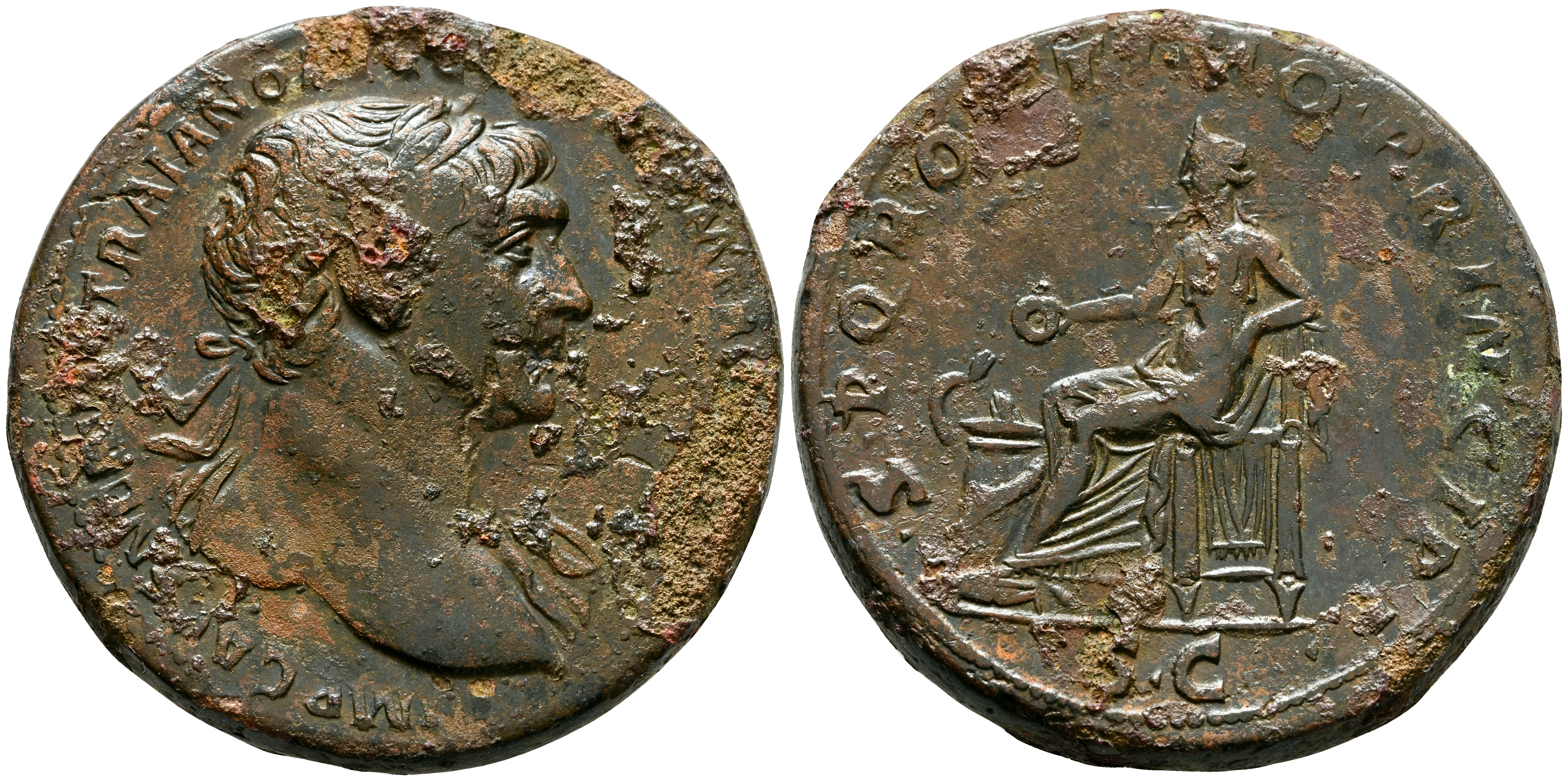 TRAJANO. Sestercio. (Ae. 27,76g/33mm). 109-110 d.C. Roma. (RIC 515). Anv: Busto laureado con ligero drapeado al hombro de Adriano a derecha, alrededro leyenda: IMP CAES NERVAE TRAIANO AVG GER DAC P M TR P COS V P P. Rev: Salus sedente a la izquierda, portando patera y alimentando serpiente enrollada en altar; en exergo: SC, alrededor leyenda:S P Q R OPTIMO PRINCIPI. MBC-. Oxidaciones limpiadas.