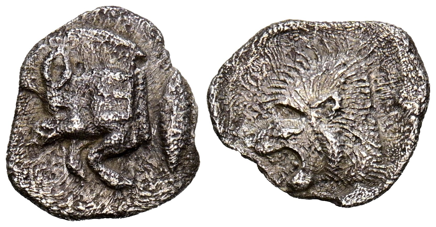 MISIA, Cícico. Óbolo. (Ar. 0,78g/12mm). 450-400 a.C. (SNG France 5386). Anv: Parte delantera de Jabalí a izquierda, detrás atún. Rev: Cabeza de león a izquierda dentro de cuadrado incuso, en campo cabeza de lobo de frente. MBC.