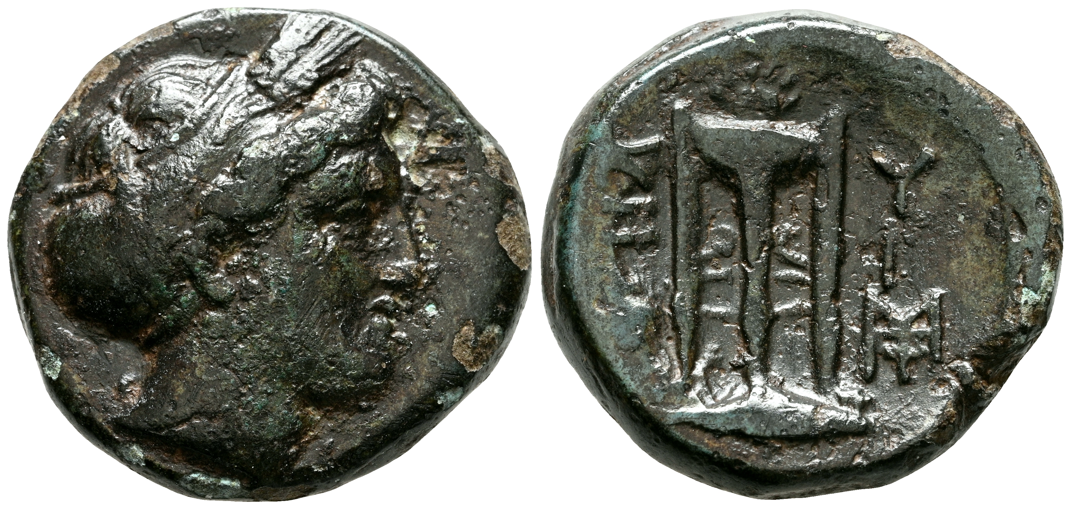 MISIA, Cícico. Ae11. (Ae. 5,84g/18mm). 300-200 a.C. (SNG von Aulock 1227). Anv: Cabeza femenina diademada a derecha. Rev: Trípode rodeado de letras griegas: K-Y / Ξ-I. MBC.