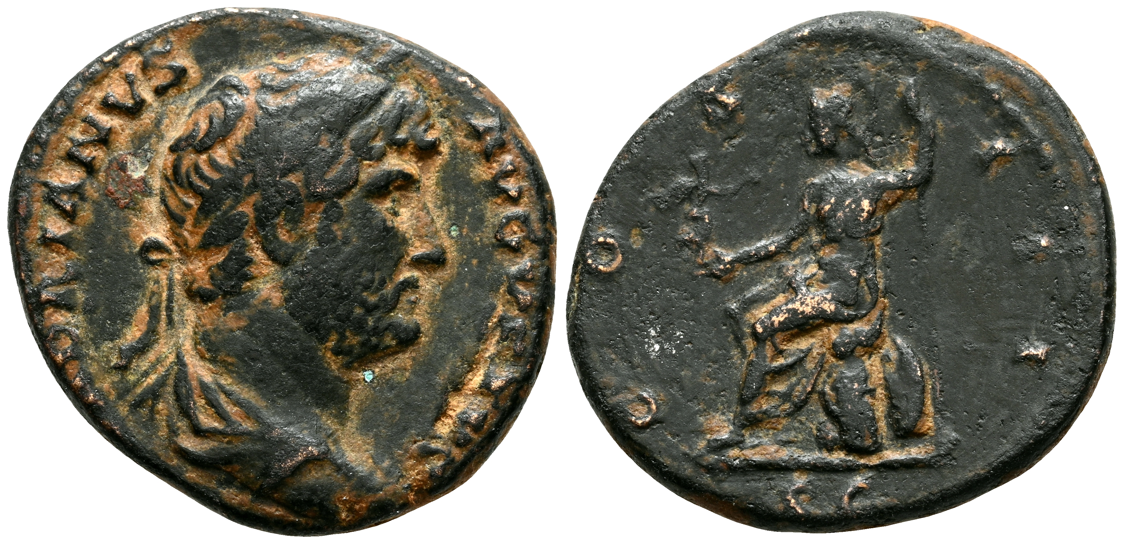 ADRIANO. Cuadrante.(Ae. 3,94g/19mm). 125-128 d.C. Roma. (RIC 428; SNG Copenhagen 207). Anv: Busto laureado y drapeadod e Adriano a derecha, alrededor leyenda: HADRIANVS AVGVSTVS. Rev: Roma sentada a izquierda sosteniendo Victoria sobre globo y portando lanza sobre escudo, en exergo: SC, alrededor leyenda: COS III. MBC.